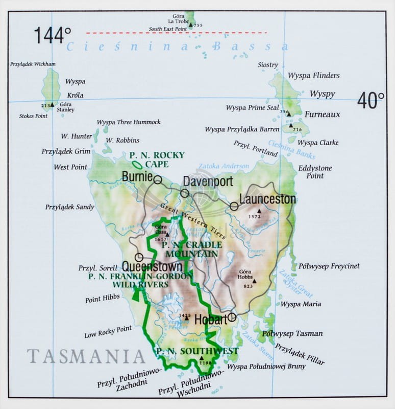 W panelach bocznych znajdują się uzupełniające informacje związane z geografią kontynentu australijskiego, mapa Tasmanii oraz przegląd krajobrazów Australii z opisami najciekawszych i najbardziej charakterystycznych form.