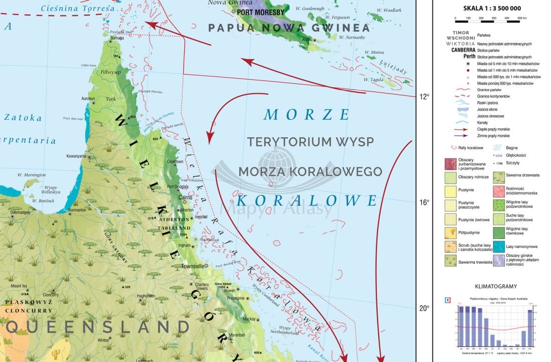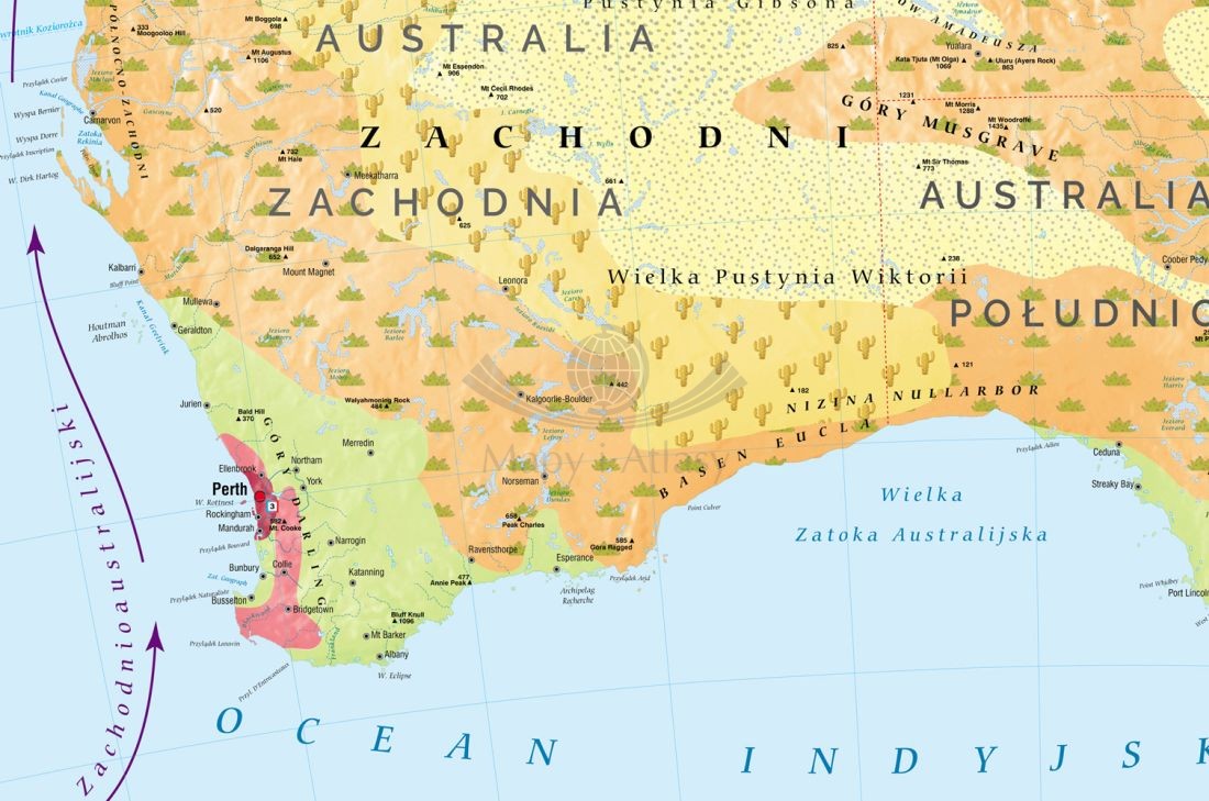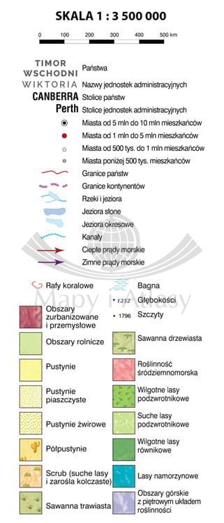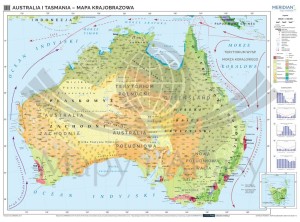 Ścienna mapa szkolna do geografii w skali 1:3 500 000 przedstawiająca różnorodność krajobrazową Australii. Na cieniowanym podkładzie (z efektem trójwymiaru) ukazane jest rozmieszczenie najważniejszych typów krajobrazu kontynentu. W treści mapy znajdują się również następujące informacje: krainy geograficzne, punkty wysokościowe i głębokościowe, prądy morskie,rafy koralowe, granice i nazwy państw, stanów oraz stolice i największe miasta.