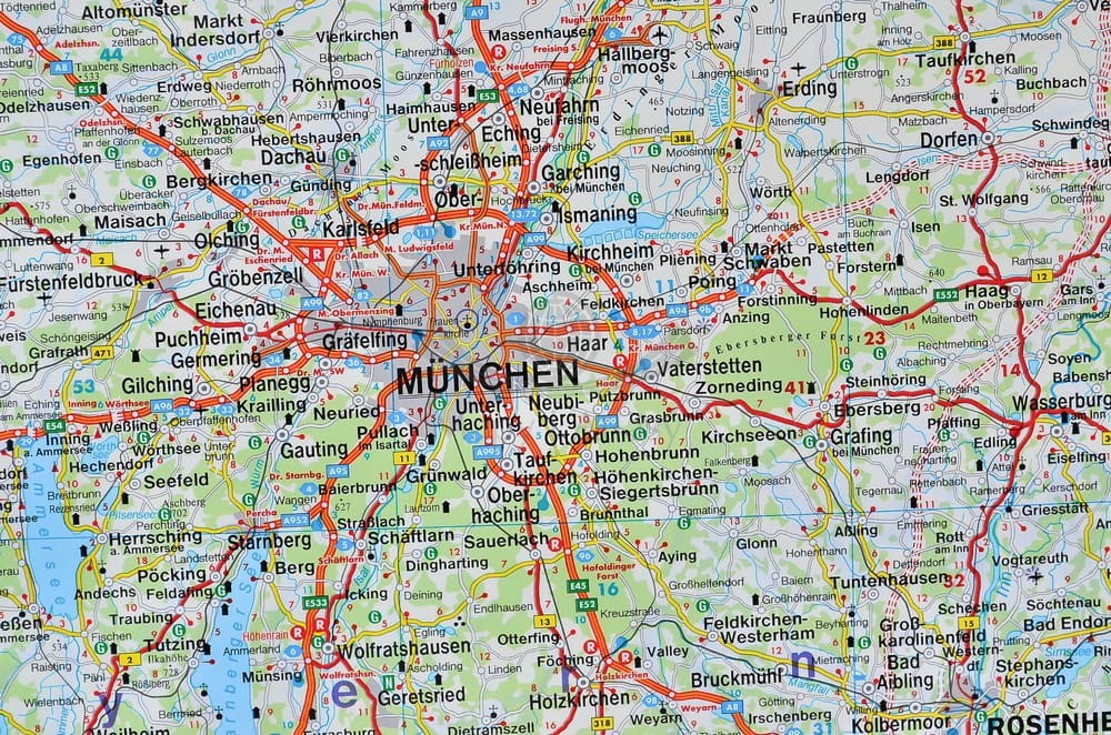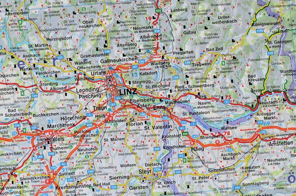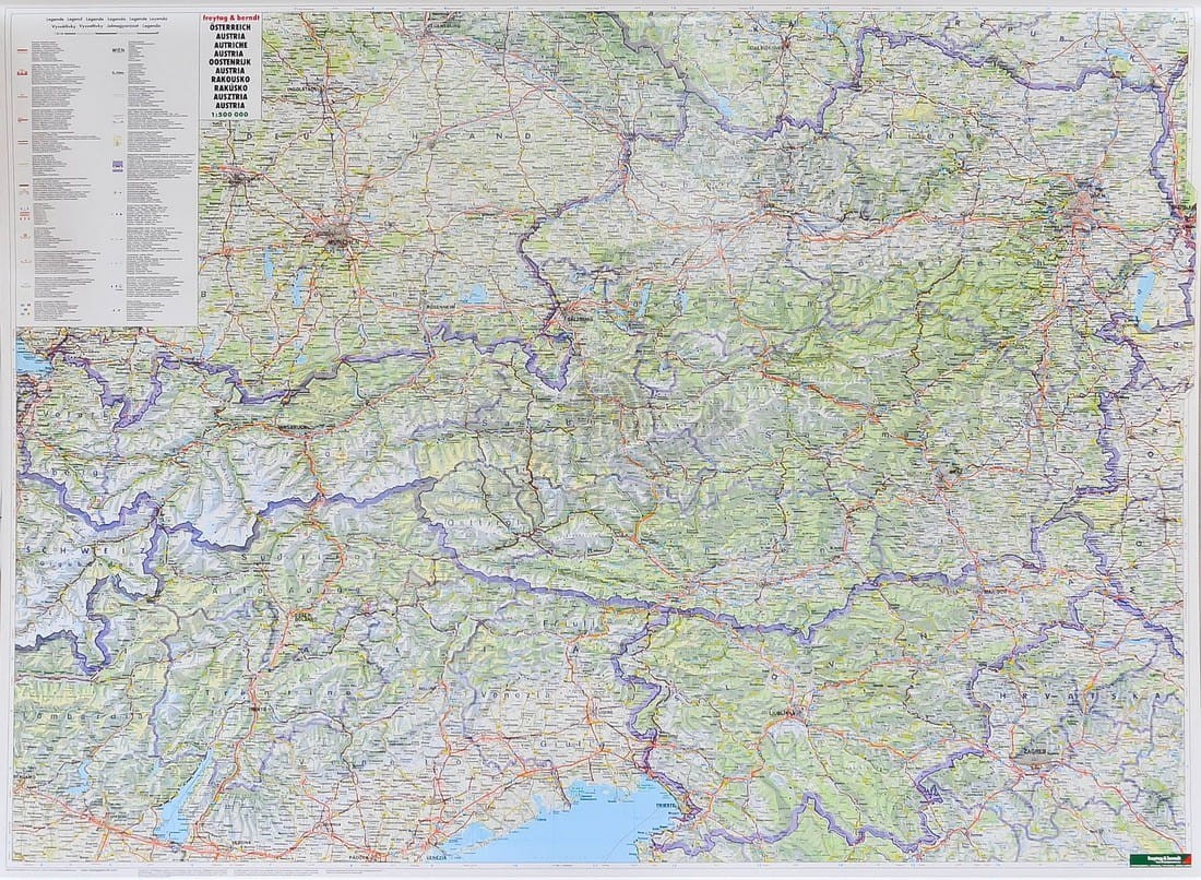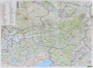 Drogowa mapa ścienna Austrii i Słowenii w skali 1:500 000, ukazująca także południową część Niemiec i północ Włoch.
