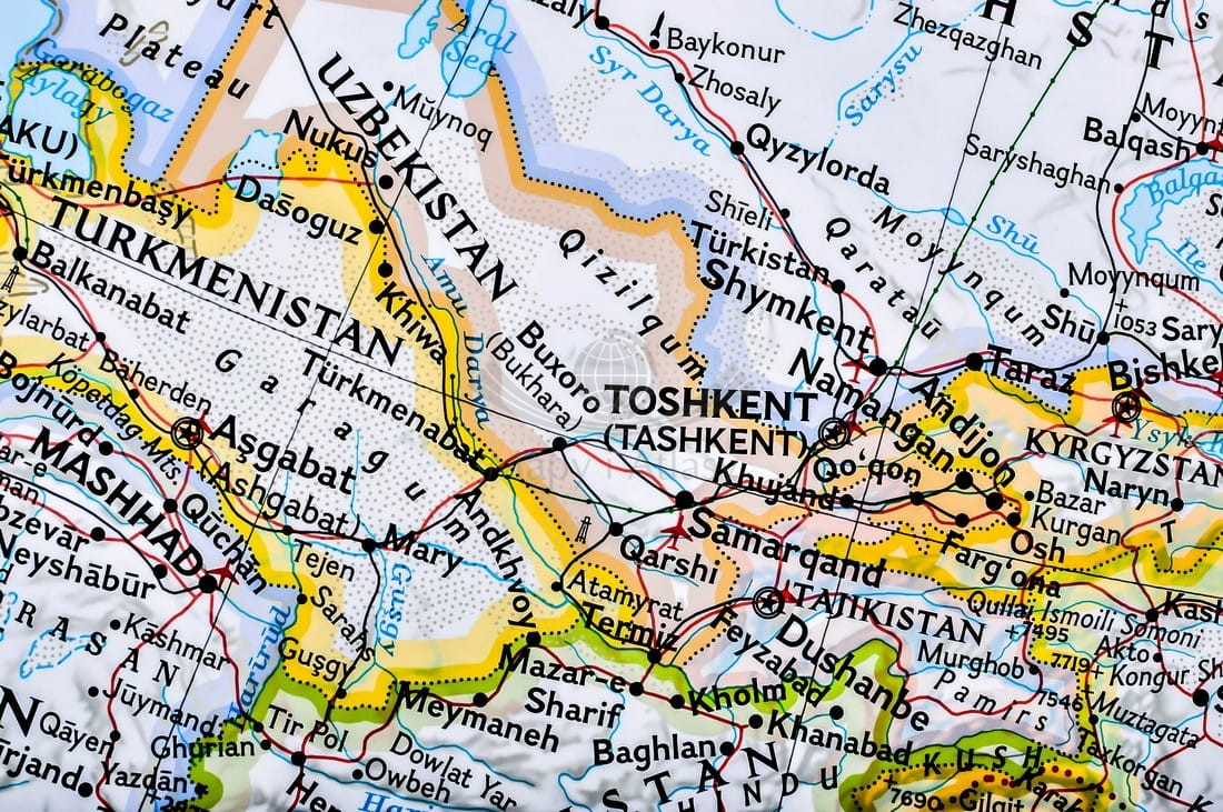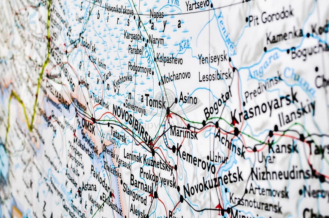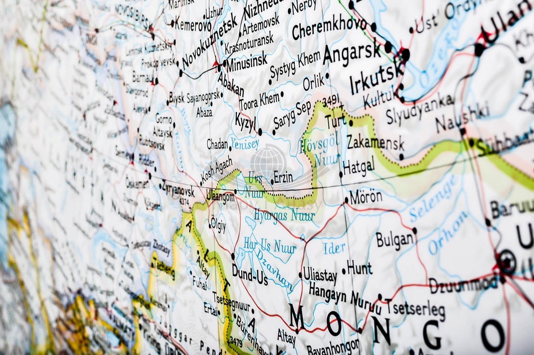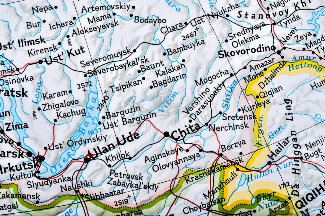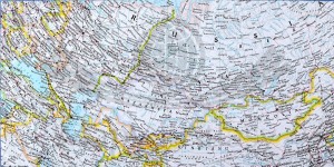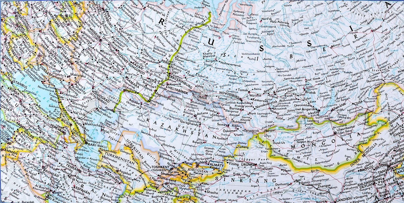 Mapa polityczna obejmująca większość Azji Środkowej, Europę Wschodnią, Syberię Zachodnią, Kazachstan, Mongolię, Sinkiang. Mapa ścienna wydawnictwa National Geographic.