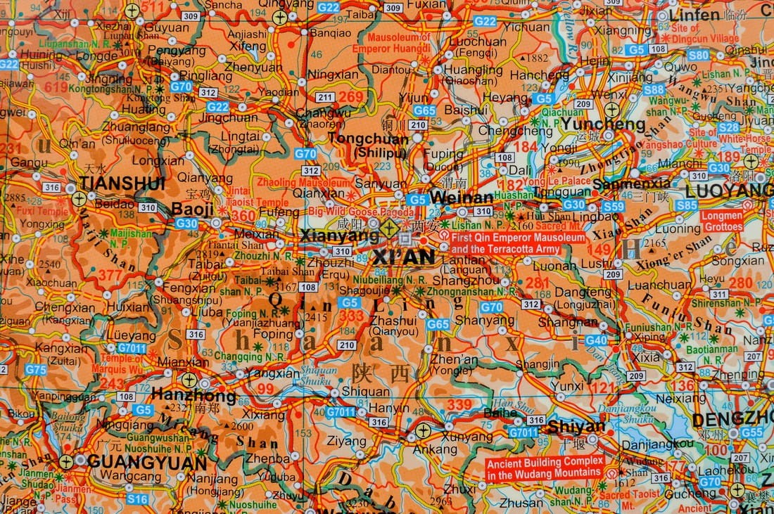 Fizyczno-drogowa mapa ścienna Chin w skali 1:4 750 000 wydawnictwa Gizi Map. Na mapie zaznaczono m.in.: ukształtowanie powierzchni, autostrady, drogi, odległości w kilometrach, numery dróg, linie kolejowe, lotniska...