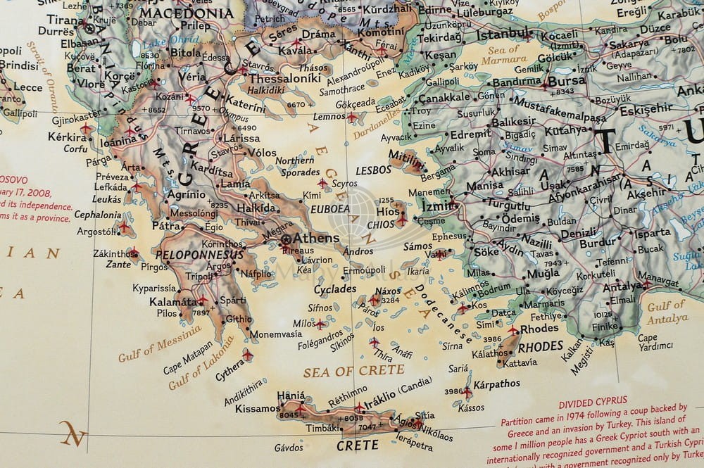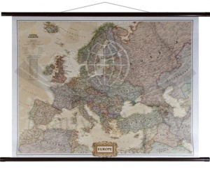 Ścienna mapa Europy w skali 1:8 425 000 z elementami mapy fizycznej, drogowej i administracyjnej. Stylizacja charakterystyczna dla National Geographic.