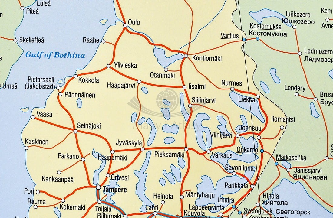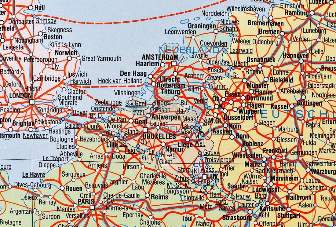 Pierwsza strona mapa ukazuje sieć kolejową Europy i Azji od Hiszpanii aż do wschodnich granic Kazachstanu. Zawiera również karton z siecią kolejową Azji począwszy od Moskwy aż do Indii, Chin i Japonii.