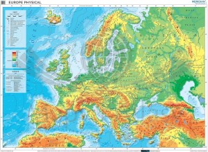 Szkolna mapa ścienna w skali 1:3 200 000 w języku angielskim przedstawiająca ukształtowanie powierzchni i krainy geograficzne Europy.