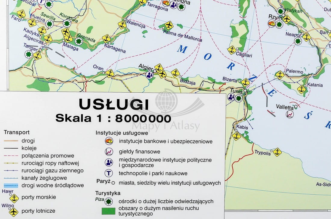 Mapa główna prezentuje zagadnienia dotyczące gospodarki Europy. Przedstawiono użytkowanie ziemi, rozmieszczenie głównych obszarów uprawy roślin i chowu zwierząt, zaznaczono duże ośrodki przemysłu wydobywczego i przetwórczego oraz największe okręgi przemysłowe...