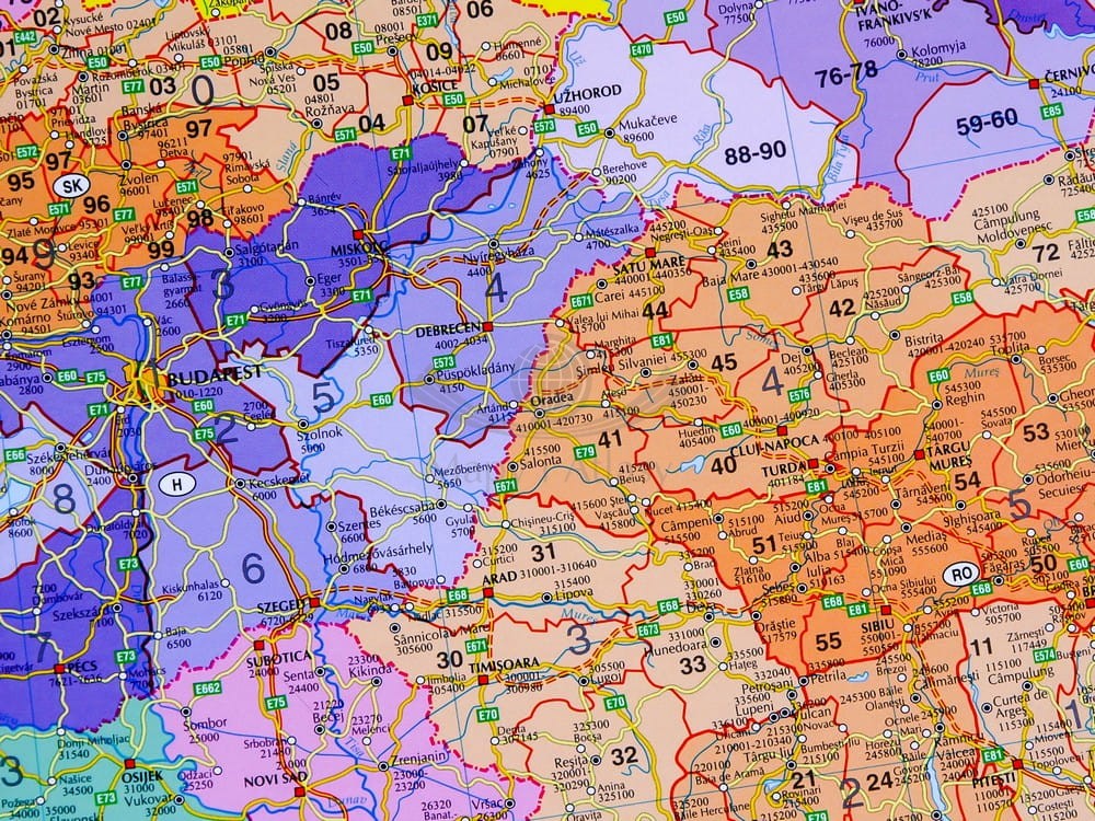 Mapa ścienna Europy w skali 1:3 600 000 z kodami pocztowymi. Obejmuje również część zachodnią Rosji i cały obszar Turcji. Mapa foliowana, oprawiona w rurki plastikowe z zawieszką ze sznurka.