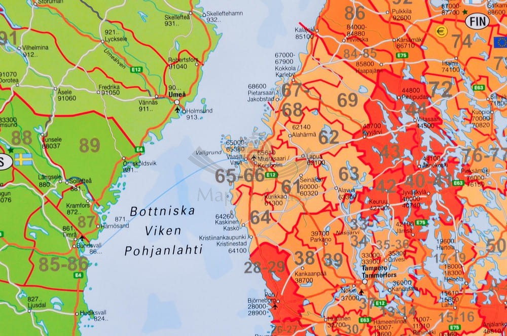 Mapa ścienna Europy z kodami pocztowymi. Mapa foliowana, oprawiona w rurki plastikowe z zawieszką ze sznurka.