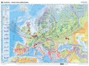 Ścienna mapa szkolna do geografii w skali 1:4 000 000 przedstawiająca różnorodność krajobrazową Europy. Na cieniowanym podkładzie (z efektem trójwymiaru) ukazane jest rozmieszczenie najważniejszych typów krajobrazu naszego kontynentu...