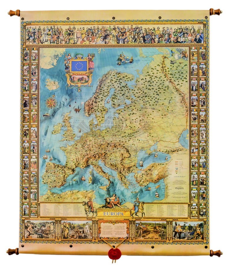 Ozdobna mapa ścienna Europy w formacie 74 x 84 cm. Z lewej i prawej strony mapy umieszczono ilustracje oraz flagi państw Europy. W górnej części znajdują się ilustracje sławnych, europejskich postaci. Na dole znajduje się tekst hymnu "Oda do radości".