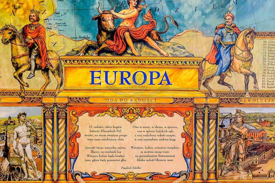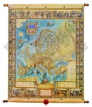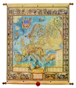 Ozdobna mapa ścienna Europy w formacie 97 x 121 cm. Z lewej i prawej strony mapy umieszczono ilustracje oraz flagi państw Europy. W górnej części znajdują się ilustracje sławnych, europejskich postaci. Na dole znajduje się tekst hymnu "Oda do radości".