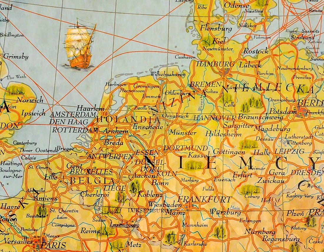 Mapa oprawiona w drewniane wałki, z zawieszką sznurkową (gotowa do powieszenia).