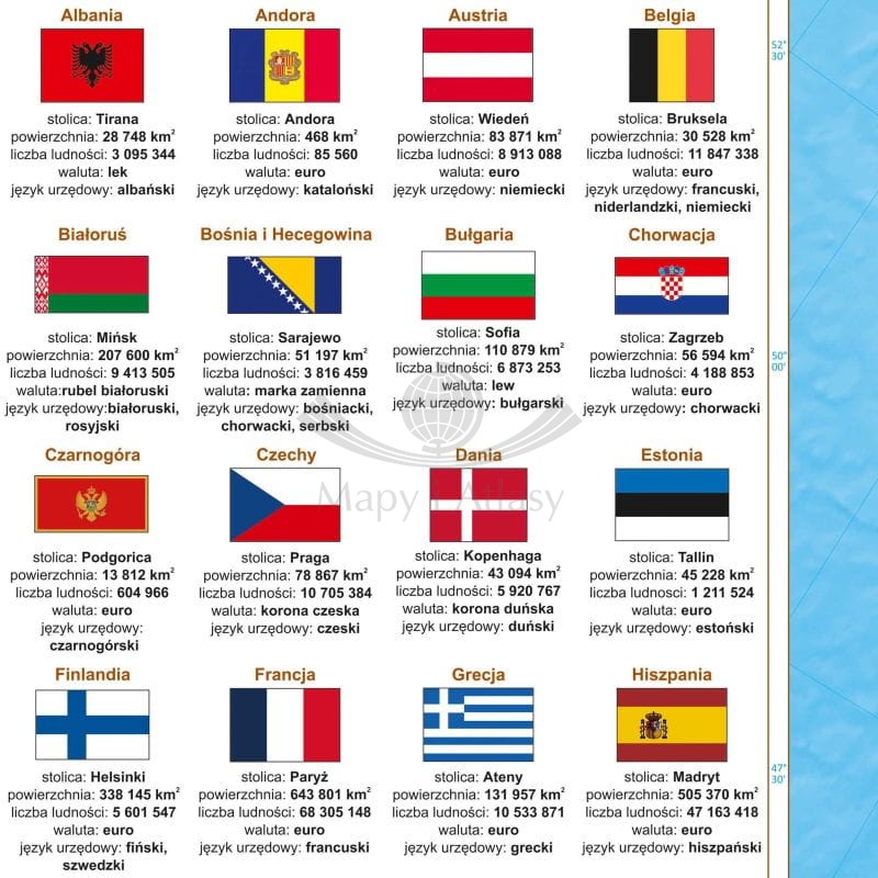Mapa ukazuje podział polityczny Europy. Dodatkowo umieszczono na niej flagi poszczególnych państw europejskich wraz z: nazwą stolicy, powierzchnią, liczbą ludności, językiem urzędowym.