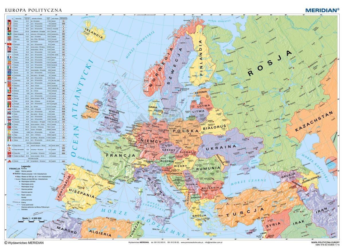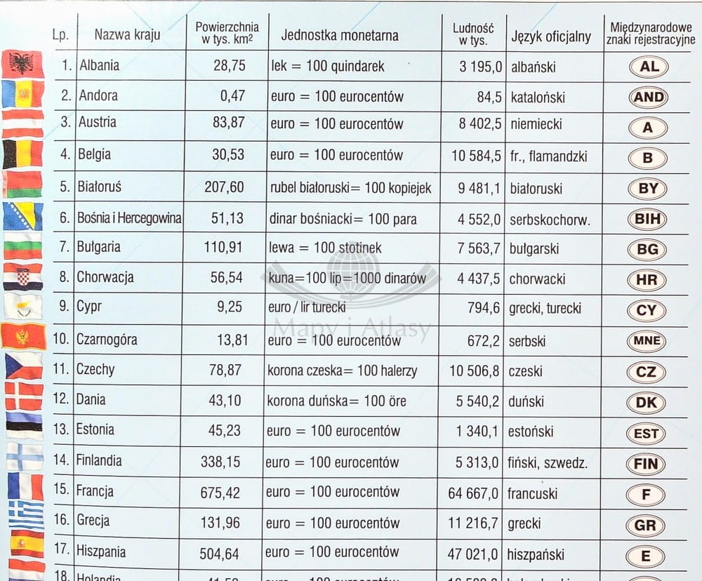 Z boku mapy umieszczone jest tabelaryczne zestawienie najważniejszych danych o wszystkich państwach europejskich. Znajdziemy tam takie informacje jak: powierzchnia, ludność, waluta, język oficjalny oraz flaga.