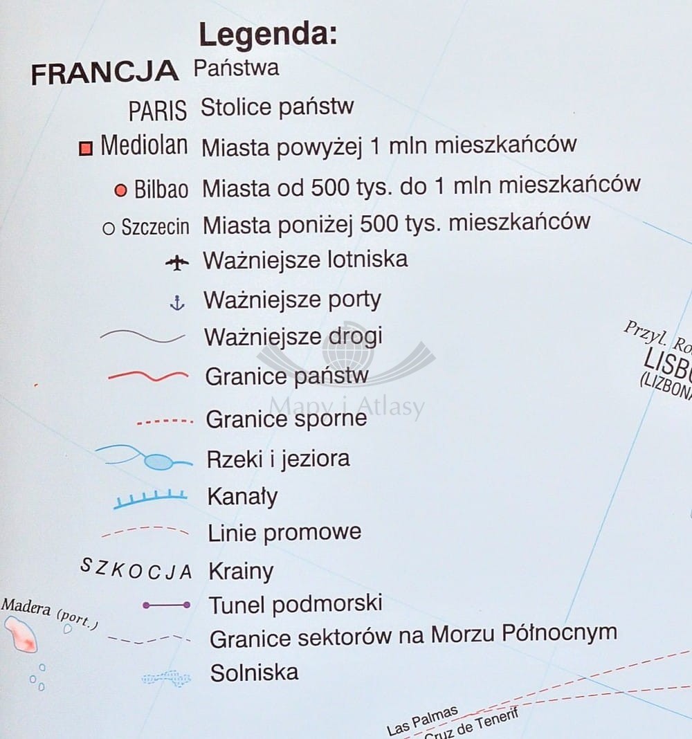 Ścienna mapa szkolna w skali 1:4 000 000 przedstawiająca najbardziej aktualny podział polityczny Europy. Układ państw i ich granice oraz główne miasta i regiony pokazane są na tle reliefu powierzchni ziemi. Na mapie pokazano sieć głównych dróg, ważne linie promowe, największe lotniska i porty morskie. Zaznaczono także granice sektorów ekonomicznych na Morzu Północnym.