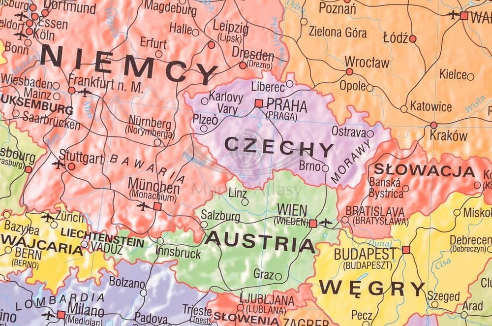 Ścienna mapa szkolna w skali 1:4 000 000 przedstawiająca najbardziej aktualny podział polityczny Europy. Układ państw i ich granice oraz główne miasta i regiony pokazane są na tle reliefu powierzchni ziemi.