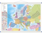 Mapa ukazuje podział polityczny Europy. Dodatkowo umieszczono na niej flagi poszczególnych państw europejskich wraz z: nazwą stolicy, powierzchnią, liczbą ludności, językiem urzędowym.