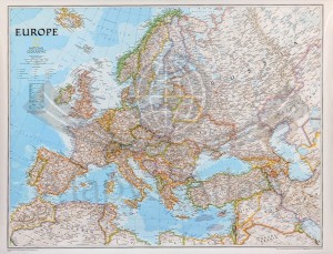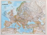 Mapa ścienna Europy w skali 1:8 399 000 z elementami mapy fizycznej, drogowej i administracyjnej w wersji matowej. Stylizacja charakterystyczna dla National Geographic. Na mapie zaznaczono m.in: granice państw, miasta...