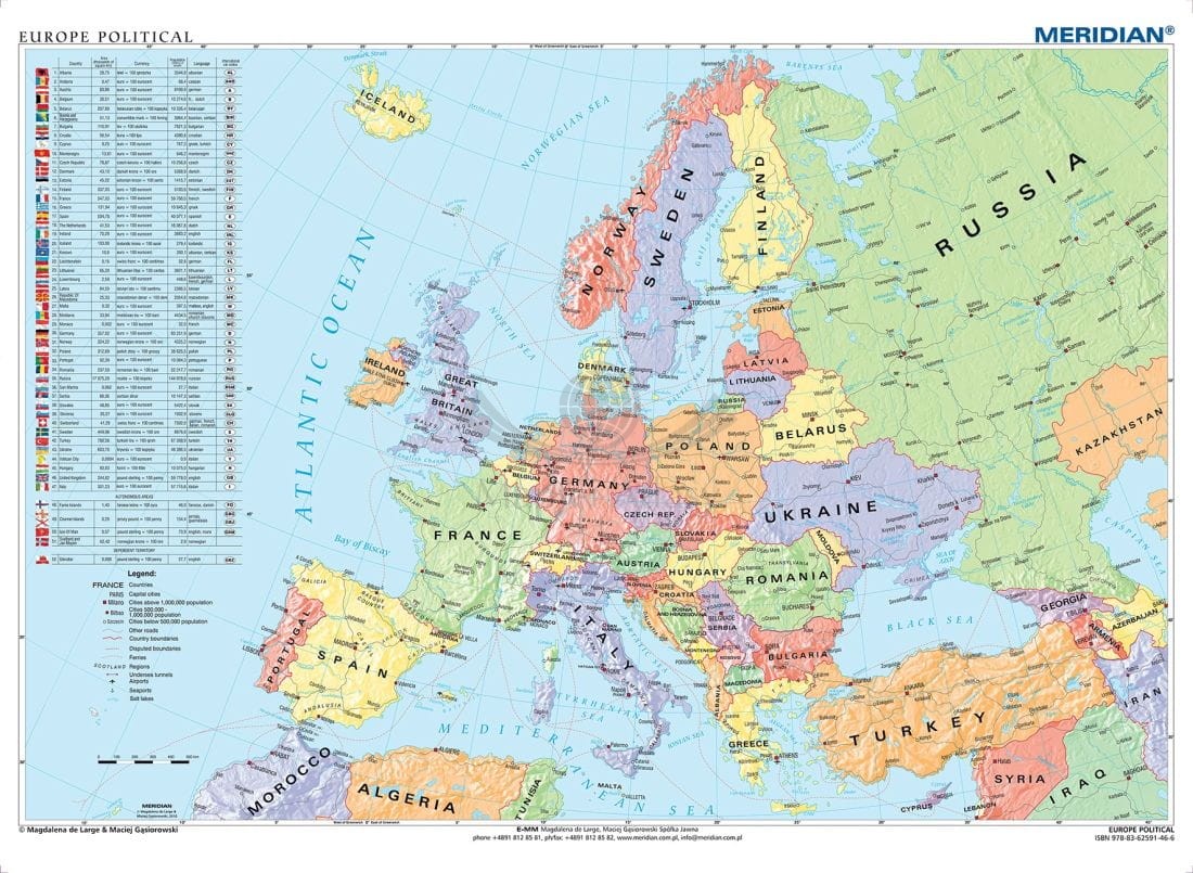Ścienna mapa w języku angielskim 1:3 200 000 przedstawiająca podział polityczny Europy. Układ państw i ich granice oraz główne miasta i regiony pokazane są na tle reliefu powierzchni ziemi.