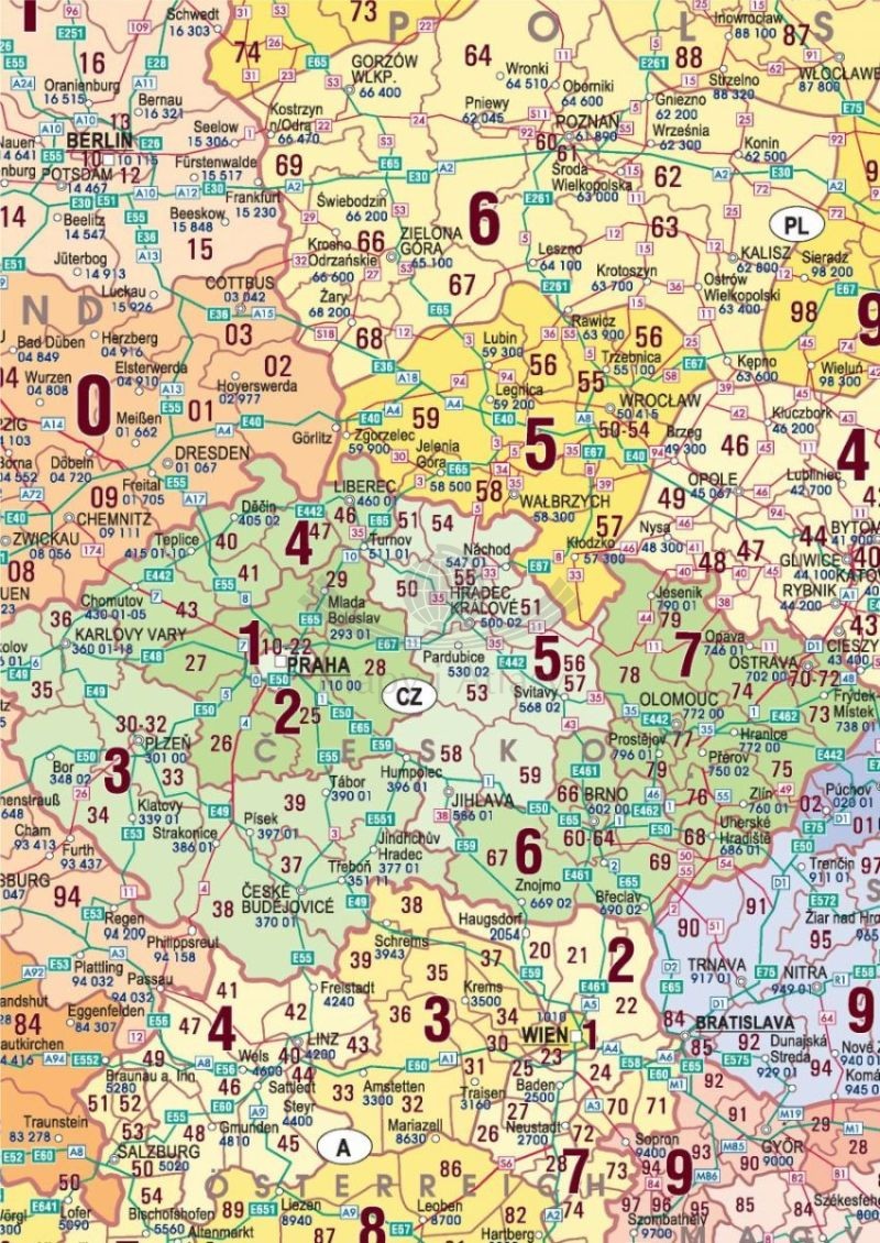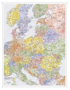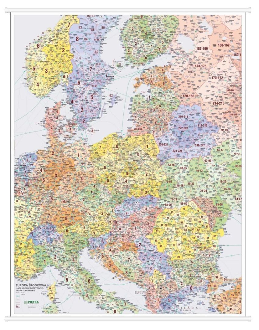 Duża mapa ścienna Europy środkowej z zaznaczonymi kodami pocztowymi. Odpowiednio dobrana kolorystyka sprawia, że mapa jest czytelna, a praca z nią - znacznie łatwiejsza. Mapa uwzględnia numery i granice okręgów pocztowych, kody pocztowe, a także podstawową sieć dróg.