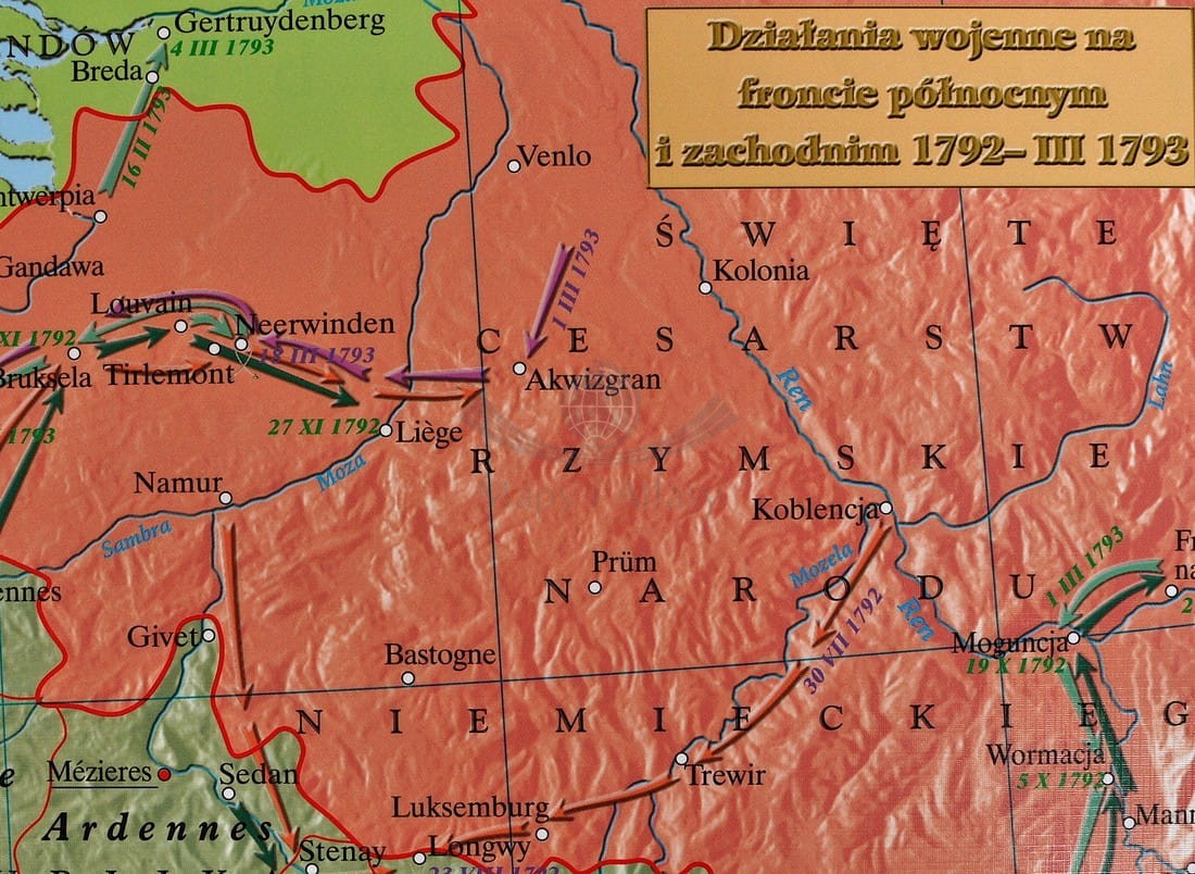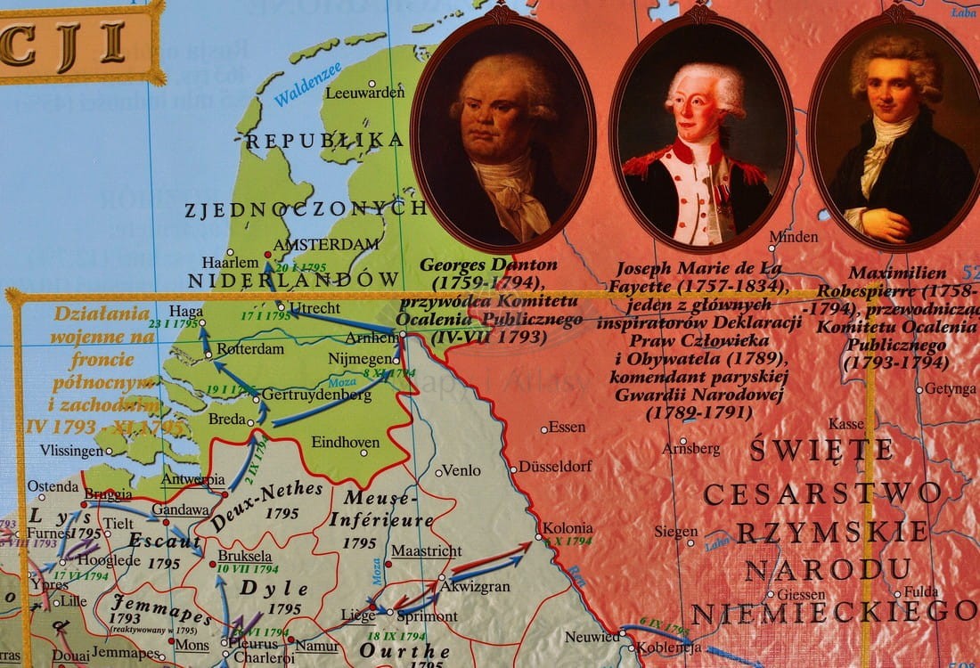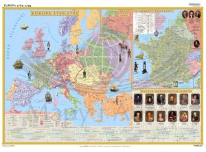 Ścienna mapa szkolna w skali 1:4 000 000 przedstawiająca Europę w latach 1789-1795 i Francję w okresie Wielkiej Rewolucji, wraz z ważniejszymi bitwami, państwami walczącymi z Francją w latach 1792-1795, rewolucyjnymi wystąpieniami w miastach we Francji oraz ruchami wojsk rosyjskich, tureckich i austriackich. Mapę dodatkowo wzbogaca interesująca grafika, liczne ilustracje oraz portrety władców ważniejszych państw.