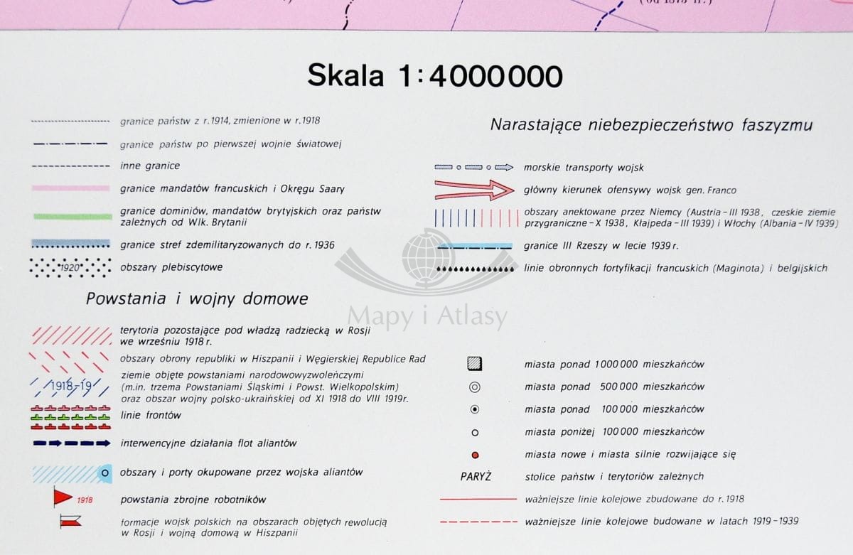 Mapa główna przedstawia najważniejsze wydarzenia okresu międzywojennego, które przyczyniły się do wybuchu II wojny światowej w skali 1:4 000 000...