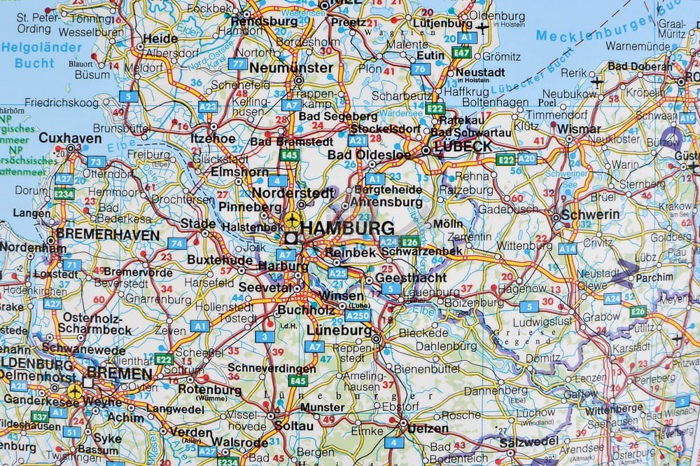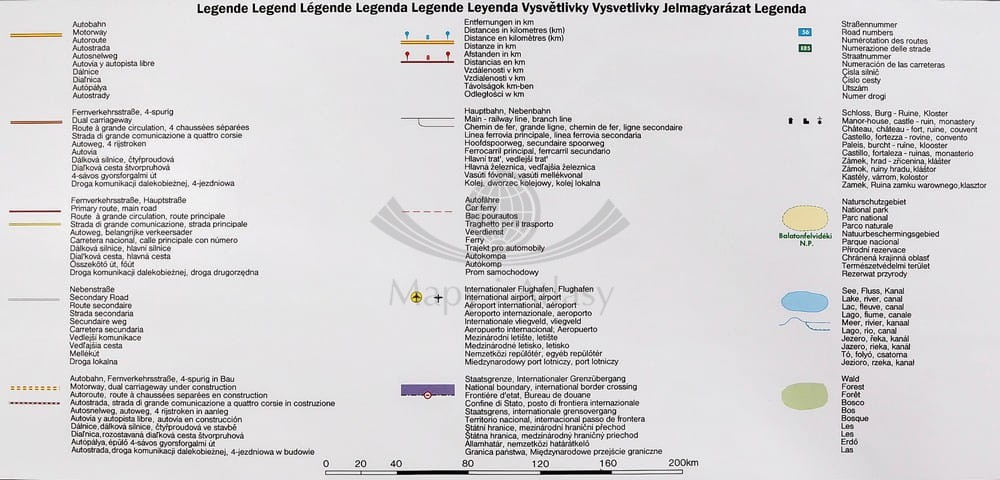 Mapa posiada legendę w 10 językach (w tym język polski). Punkty skrajne na wschodzie: Kopenhaga, Rostock, Norymberga, Livorno.