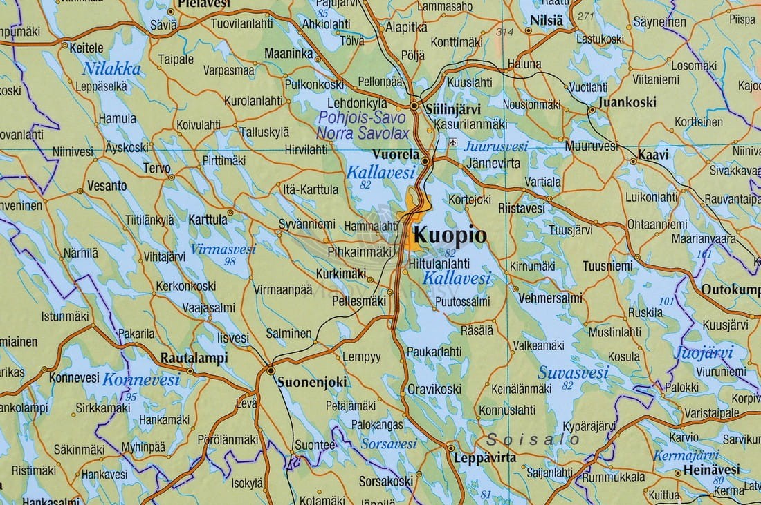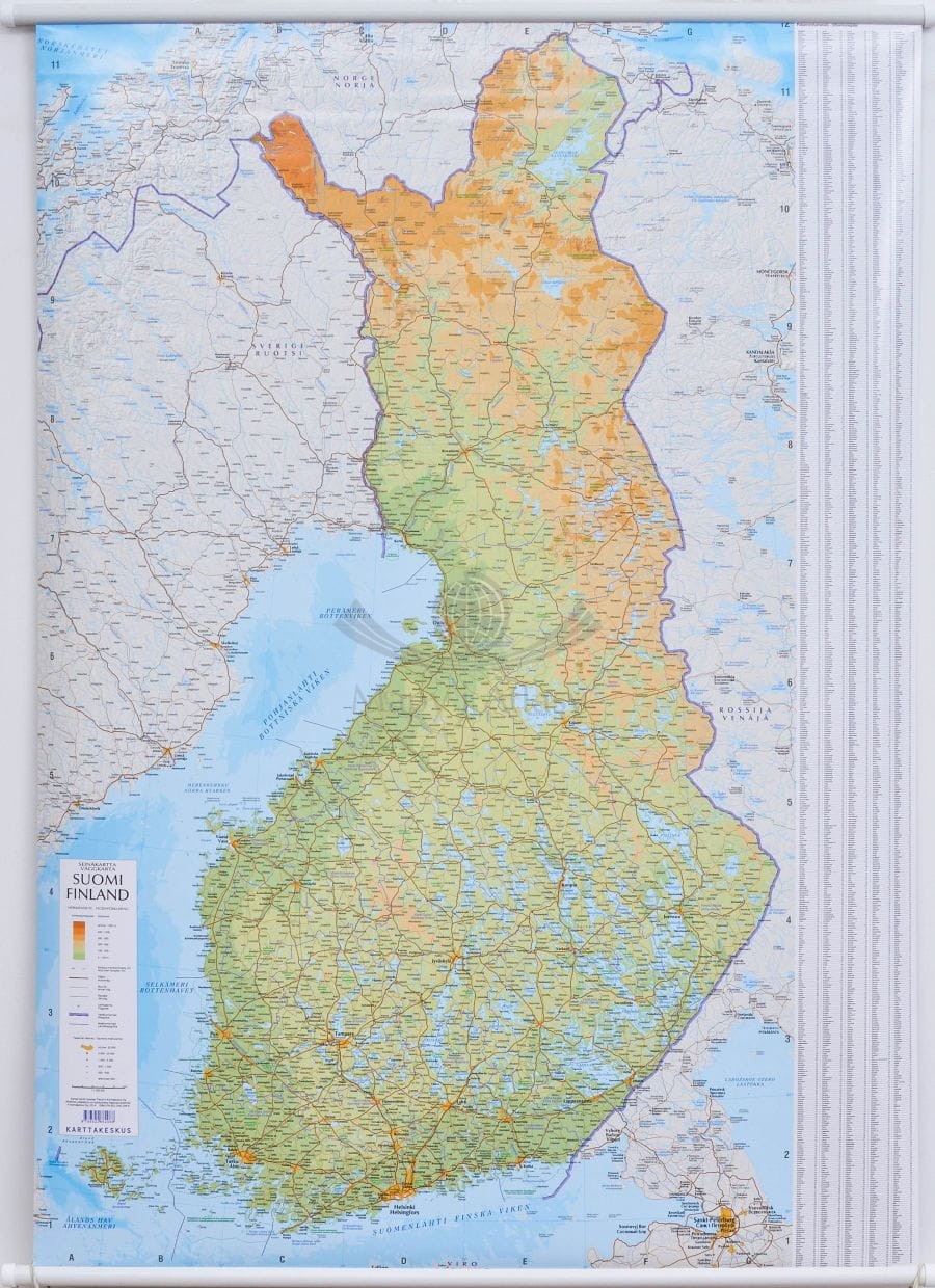 Drogowo-fizyczna mapa ścienna Finlandii w skali 1:1 000 000 wydawnictwa Karttakeskus. Na mapie zaznaczono m.in.: autostrady, drogi, miasta, granice państw, granice administracyjne, linie kolejowe, lotniska...
