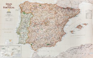 Mapa ścienna Hiszpanii i Portugalii w wersji ekskluzywnej (w odcieniach brązu). Mapa z elementami mapy drogowej i administracyjnej oraz elementami mapy fizycznej i turystycznej (ukształtowanie terenu, parki narodowe). Stylizacja charakterystyczna dla National Geographic.