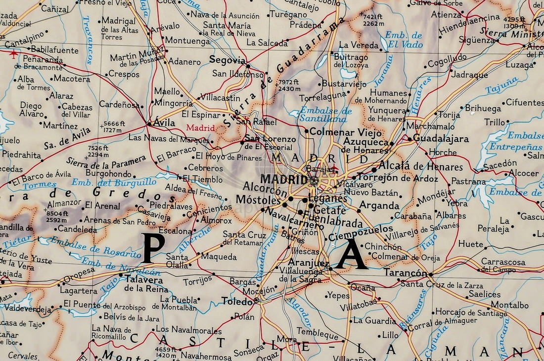 Mapa ścienna Hiszpanii i Portugalii w wersji ekskluzywnej (w odcieniach brązu). Mapa z elementami mapy drogowej i administracyjnej oraz elementami mapy fizycznej i turystycznej (ukształtowanie terenu, parki narodowe).