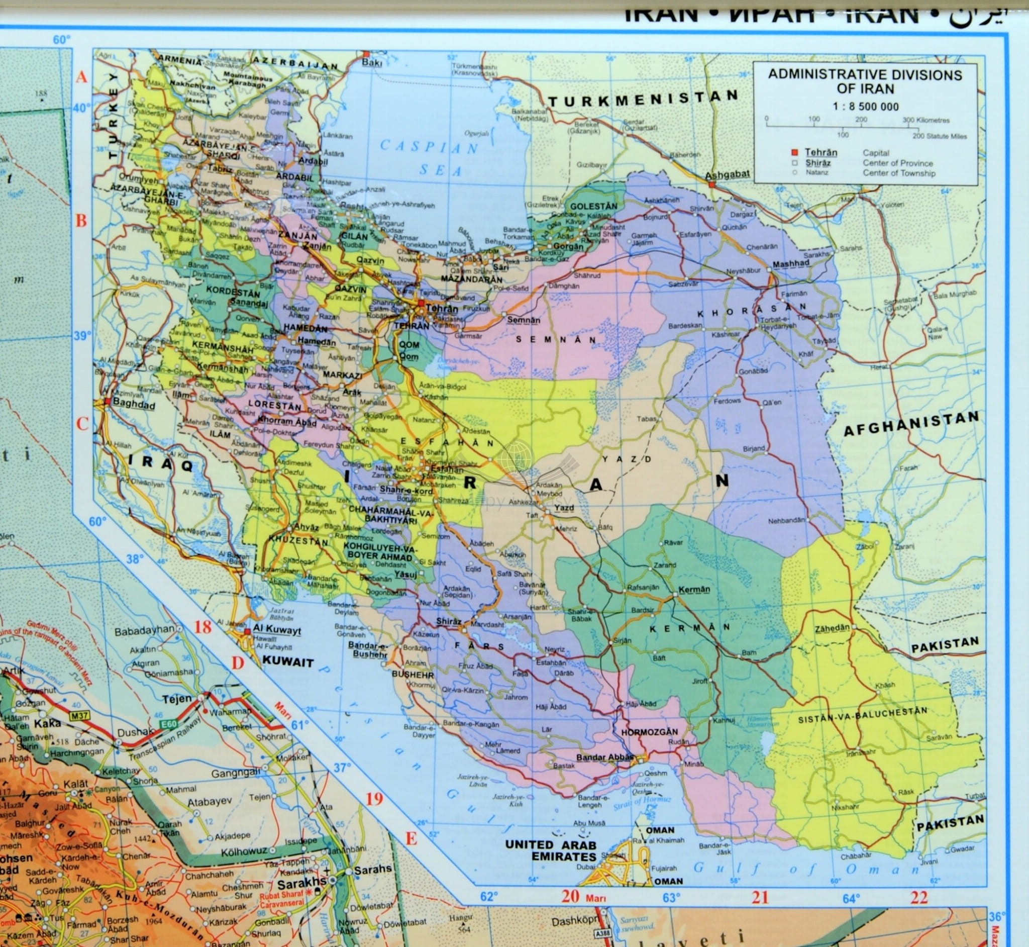 Ścienna mapa fizyczno-drogowa Iranu w skali 1:2 000 000. Zawiera karton z podziałem Iranu na jednostki administracyjne.