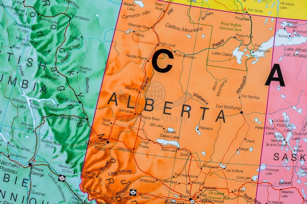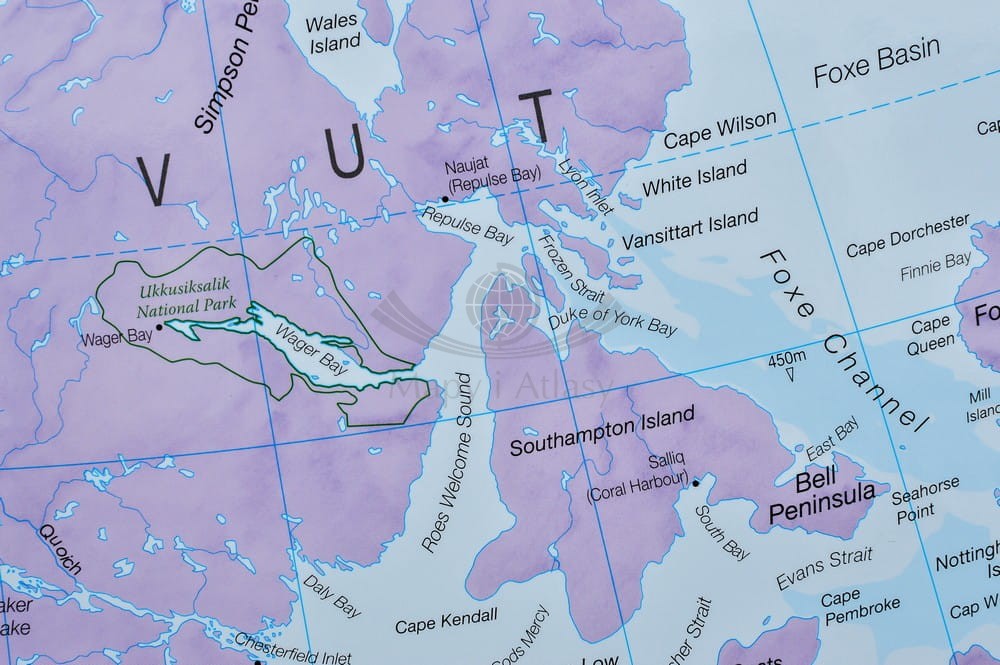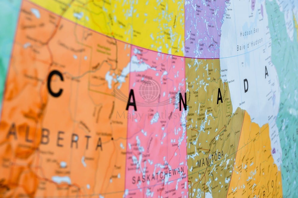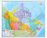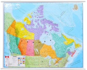 Ścienna mapa polityczna Kanady w skali 1:4 850 000 z zaznaczoną siecią dróg. Cieniowaniem zaznaczono ukształtowanie terenu. Piękne, żywe, wyraziste kolory.