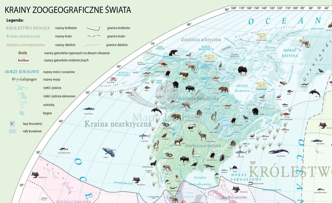 Ścienna mapa szkolna w skali 1:22 000 000 przedstawiająca podział świata zwierzęcego na królestwa, krainy i dzielnice zoogeograficzne. Publikacja jest bogato ilustrowana. Każdy obszar przypisany ma najbardziej charakterystyczne dla siebie gatunki zwierząt, z wyszczególnionymi gatunkami endemicznymi.