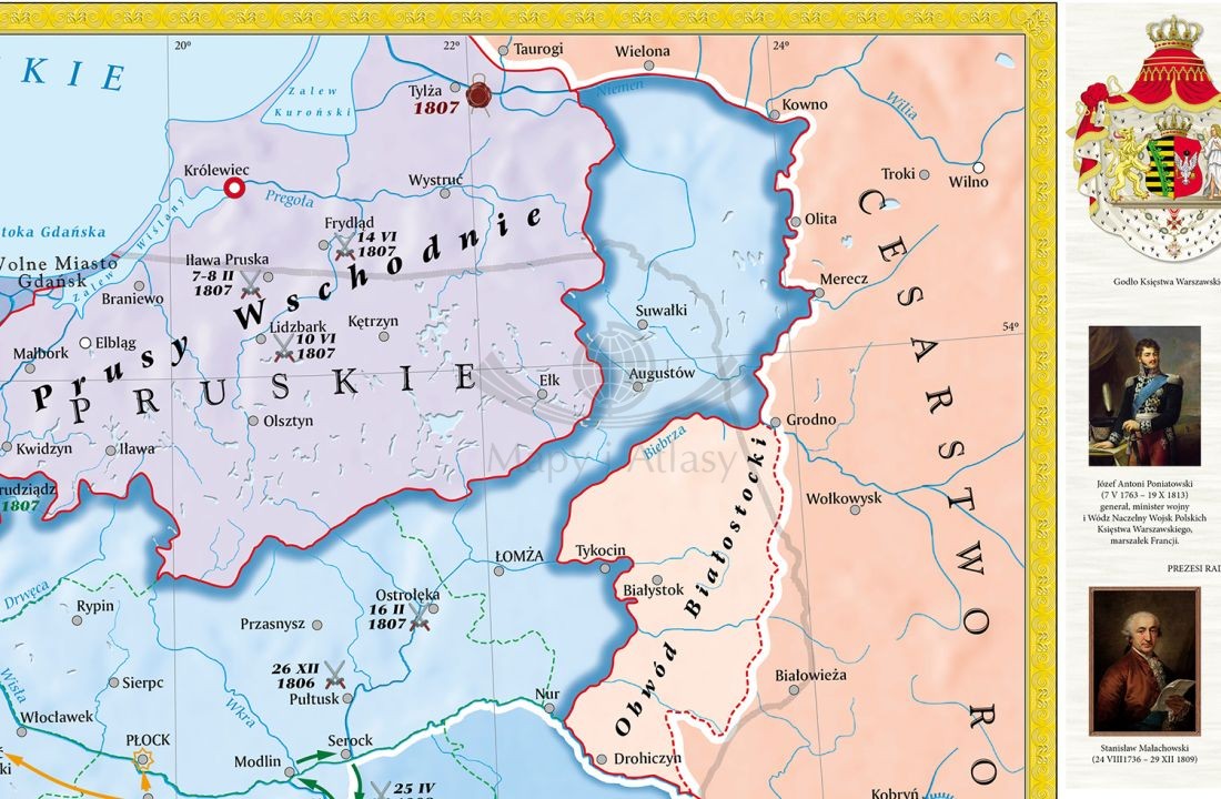 Ścienna mapa szkolna w skali 1:860 000 przedstawiająca w prosty i przejrzysty sposób granice Królestwa Warszawskiego na przełomie lat 1807-1815 wraz z oznaczeniami zdobytych miast, obleganych twierdz pruskich oraz bitwami prowadzonymi przez Napoleona.