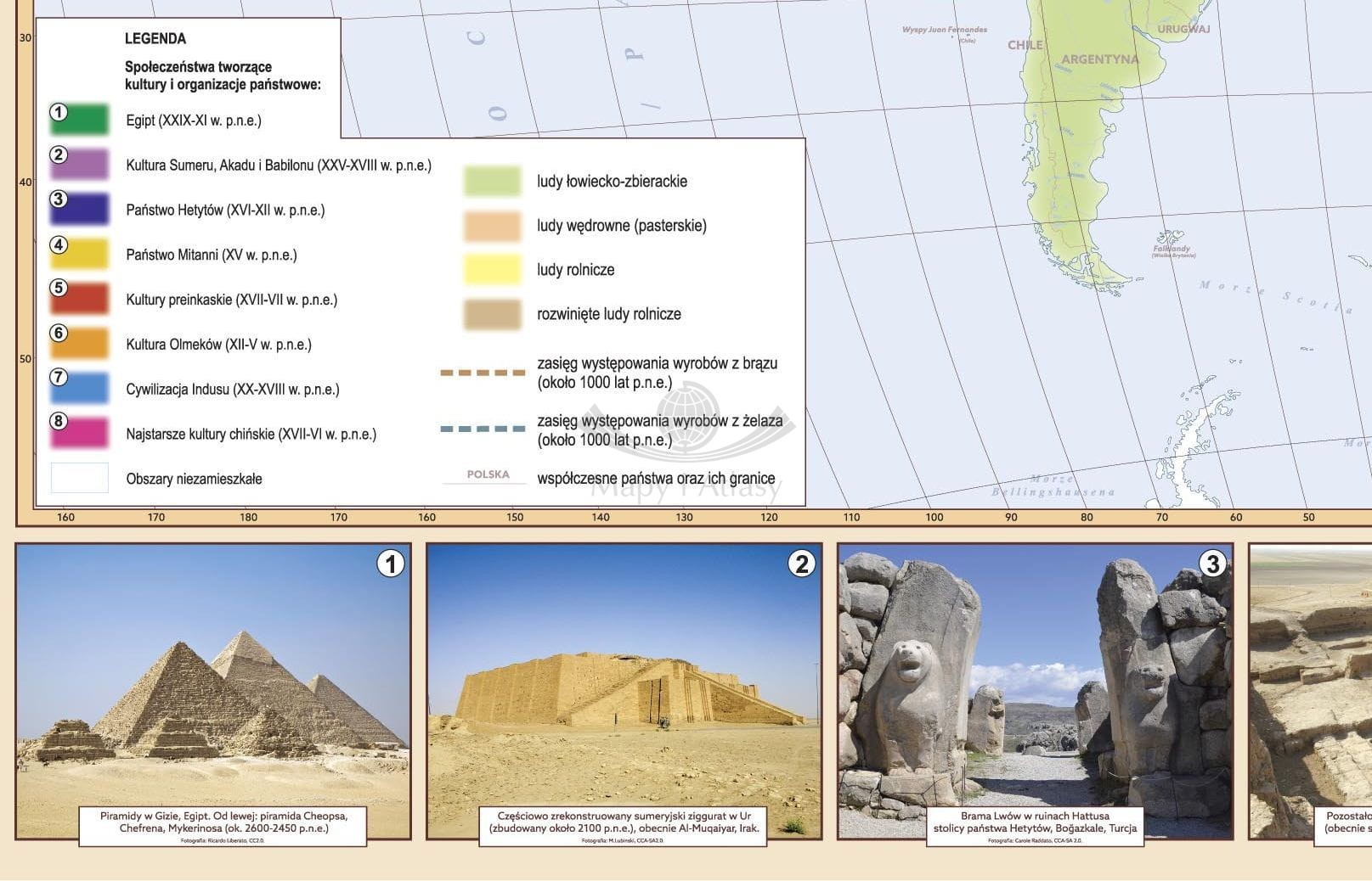 Szkolna mapa ścienna w skali 1:28 000 000 przedstawiająca najstarsze cywilizacje świata.
