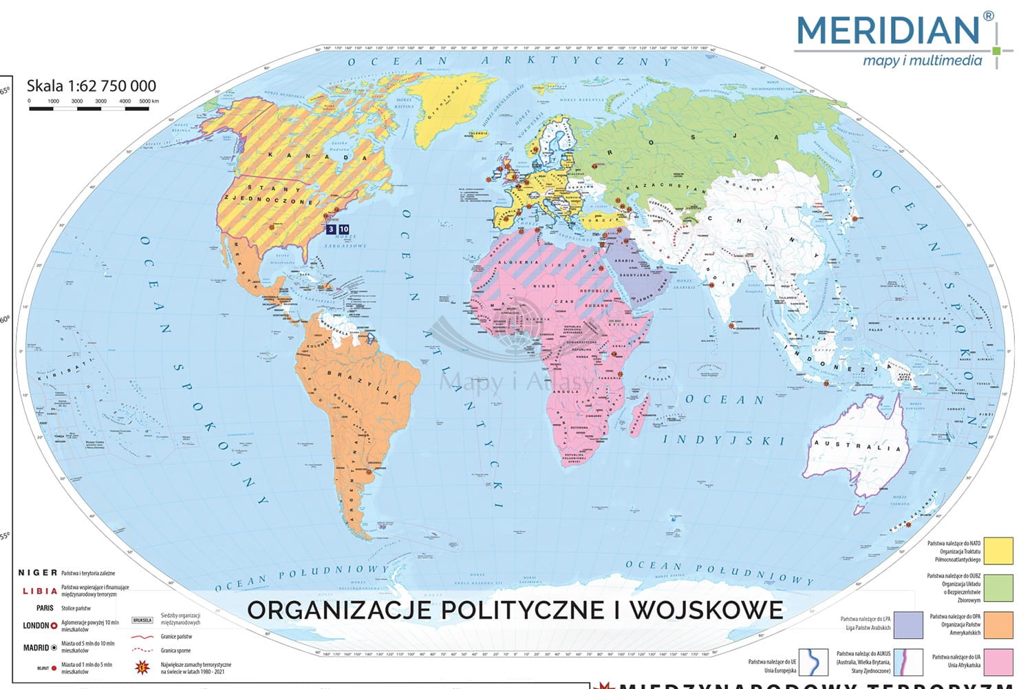 Europa, Świat. NATO / Międzynarodowy terroryzm. Mapa ścienna 160 x 120 cm. Drewniane półwałki