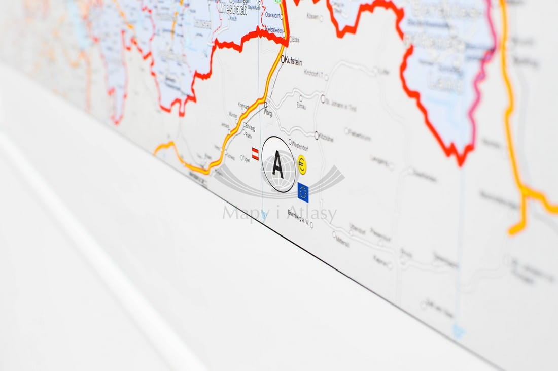 Laminat błyszczący, umożliwiający stosowanie markerów suchościeralnych i wodnych. Mapa oprawiona w rurki, gotowa do powieszenia.