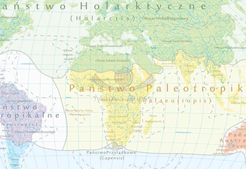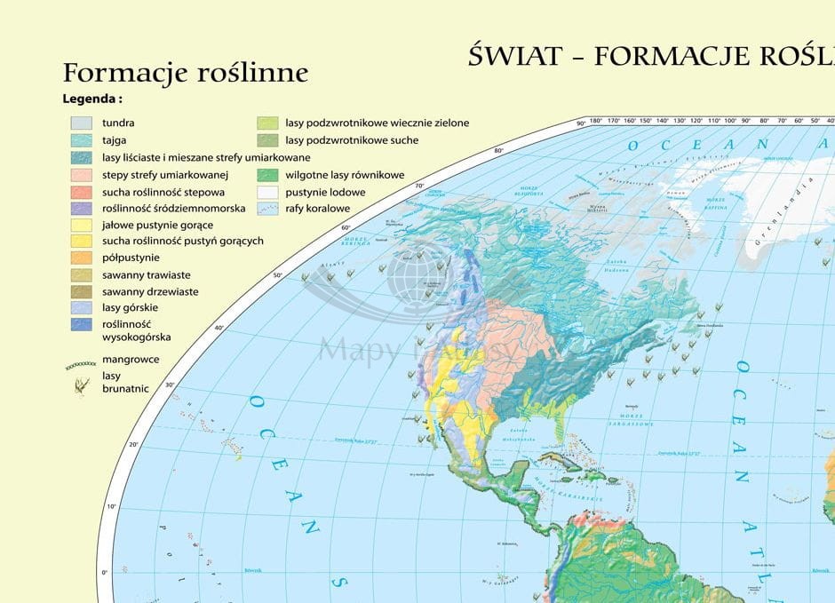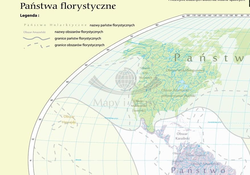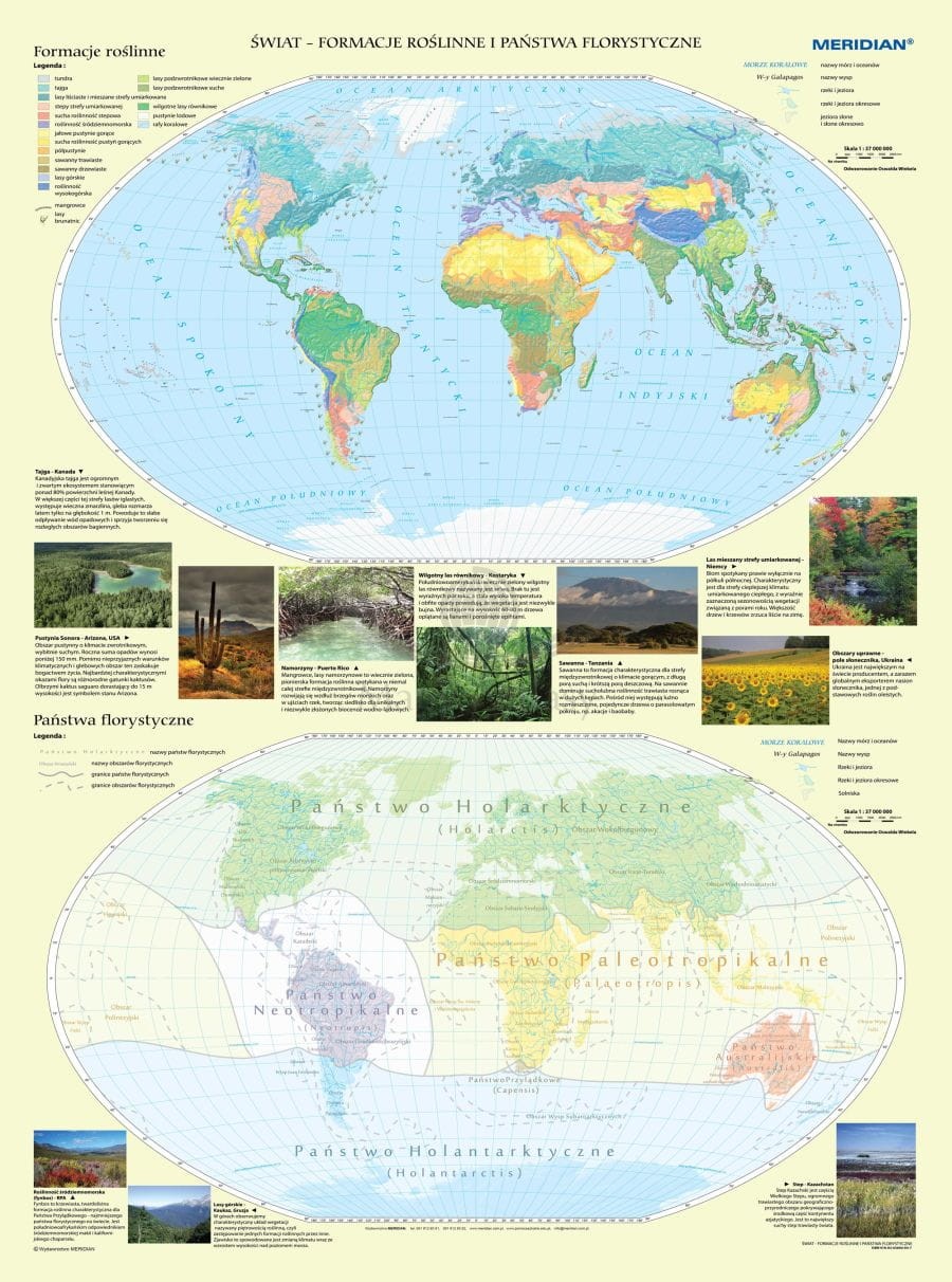 Ścienna, dwudzielna mapa szkolna w skali 1:30 000 000 przedstawiająca syntetycznie i czytelnie państwa florystyczne oraz formacje roślinne na świecie.