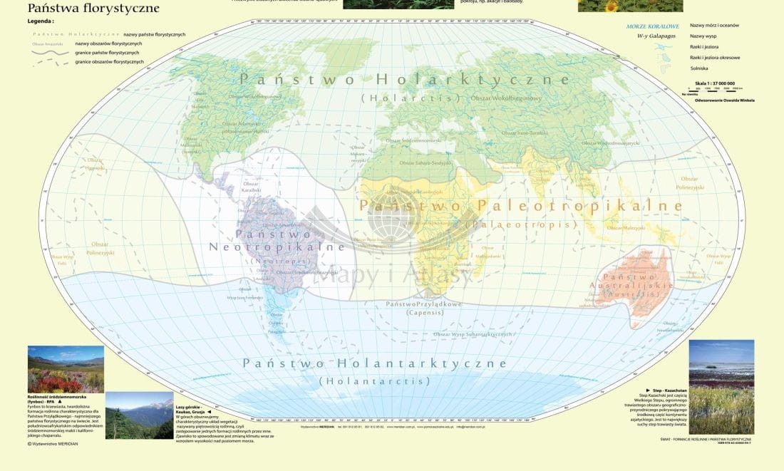 Ścienna, dwudzielna mapa szkolna w skali 1:30 000 000 przedstawiająca syntetycznie i czytelnie państwa florystyczne oraz formacje roślinne na świecie...