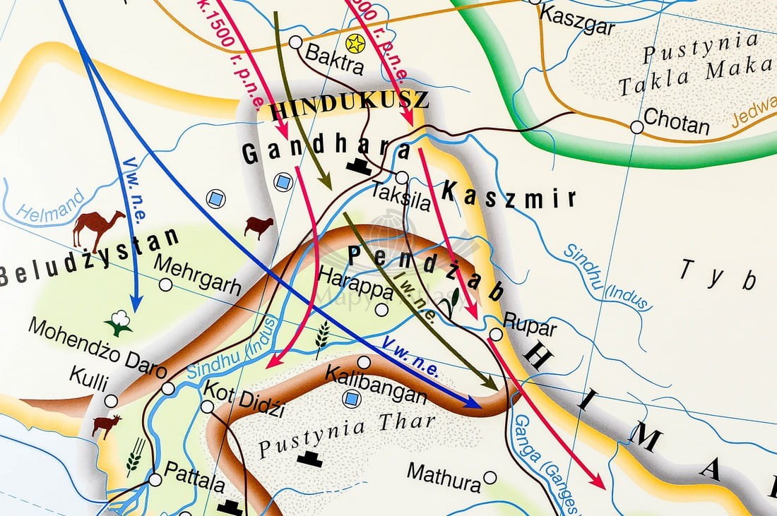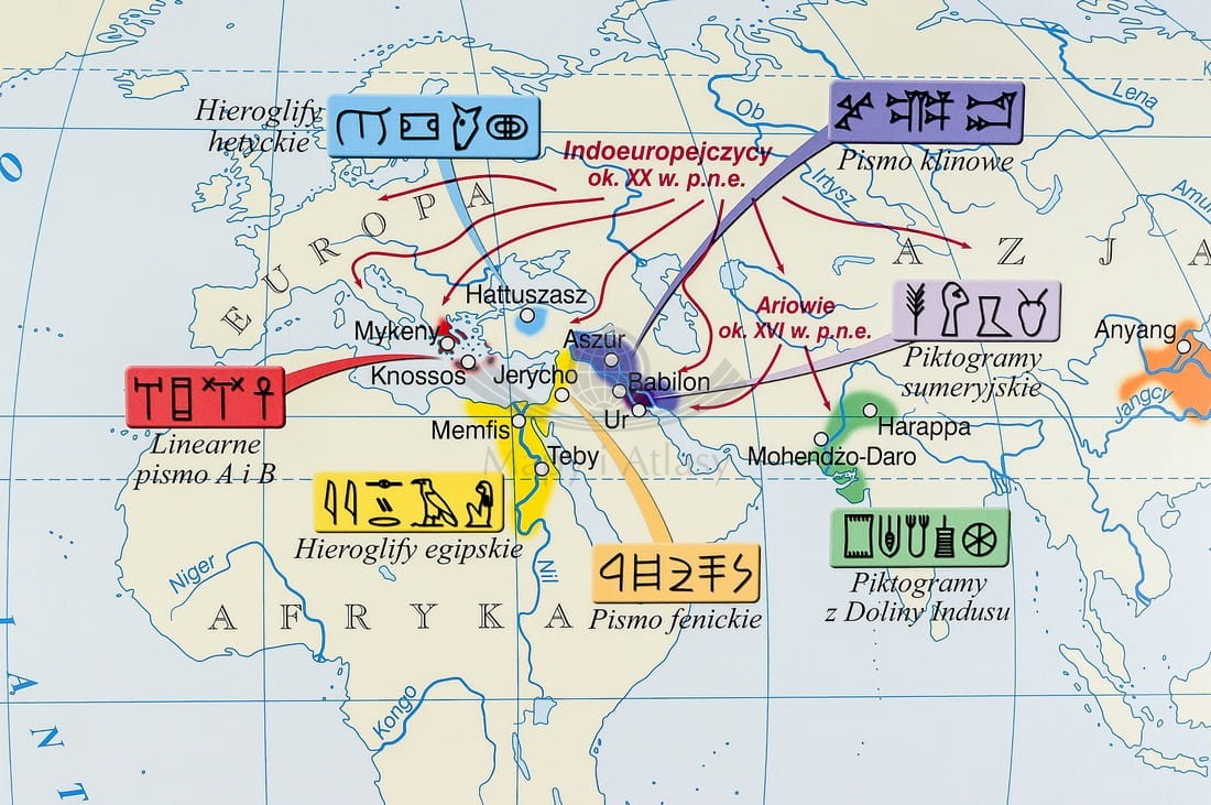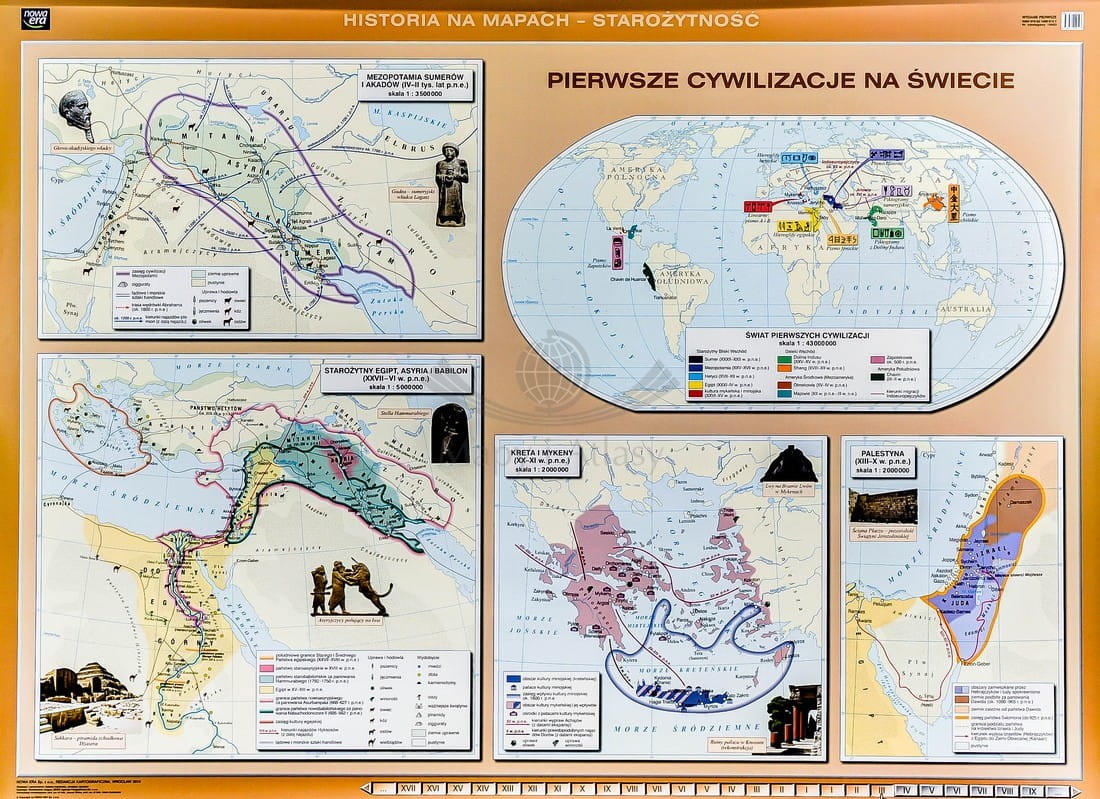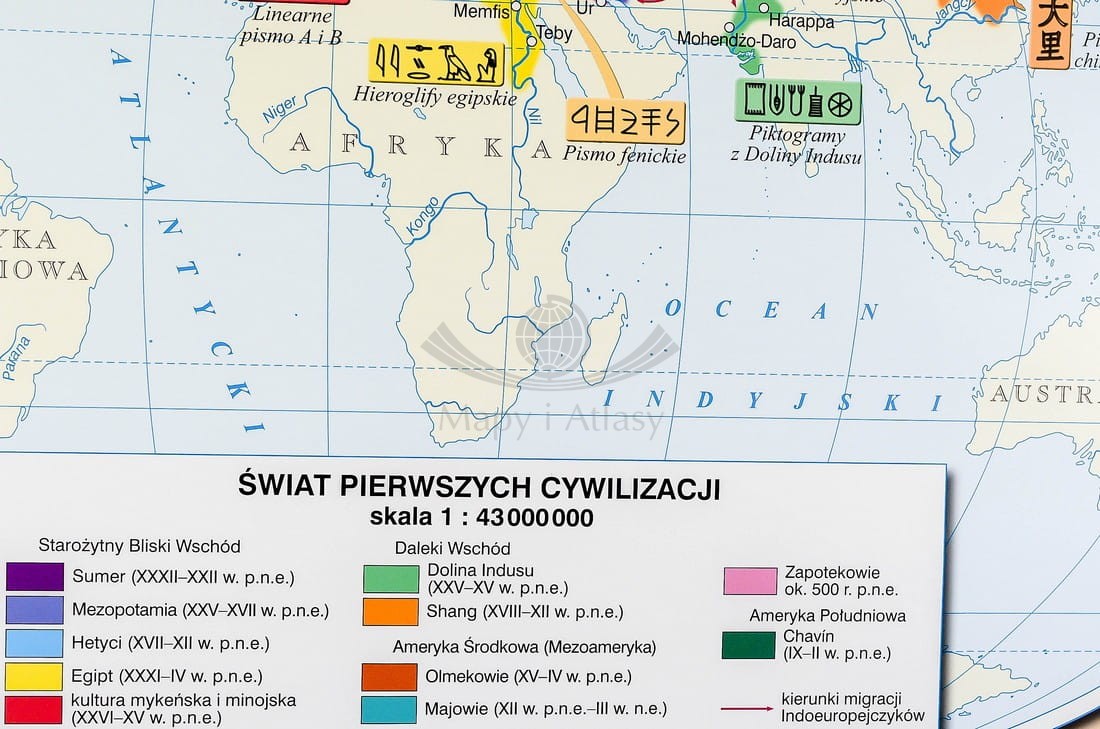 Na pierwszej stronie zatytułowanej Pierwsze cywilizacje przedstawiono 5 map. Mapa Świat pierwszych cywilizacji w skali 1:43 000 000 prezentuje rozmieszczenie pierwszych cywilizacji na ziem...