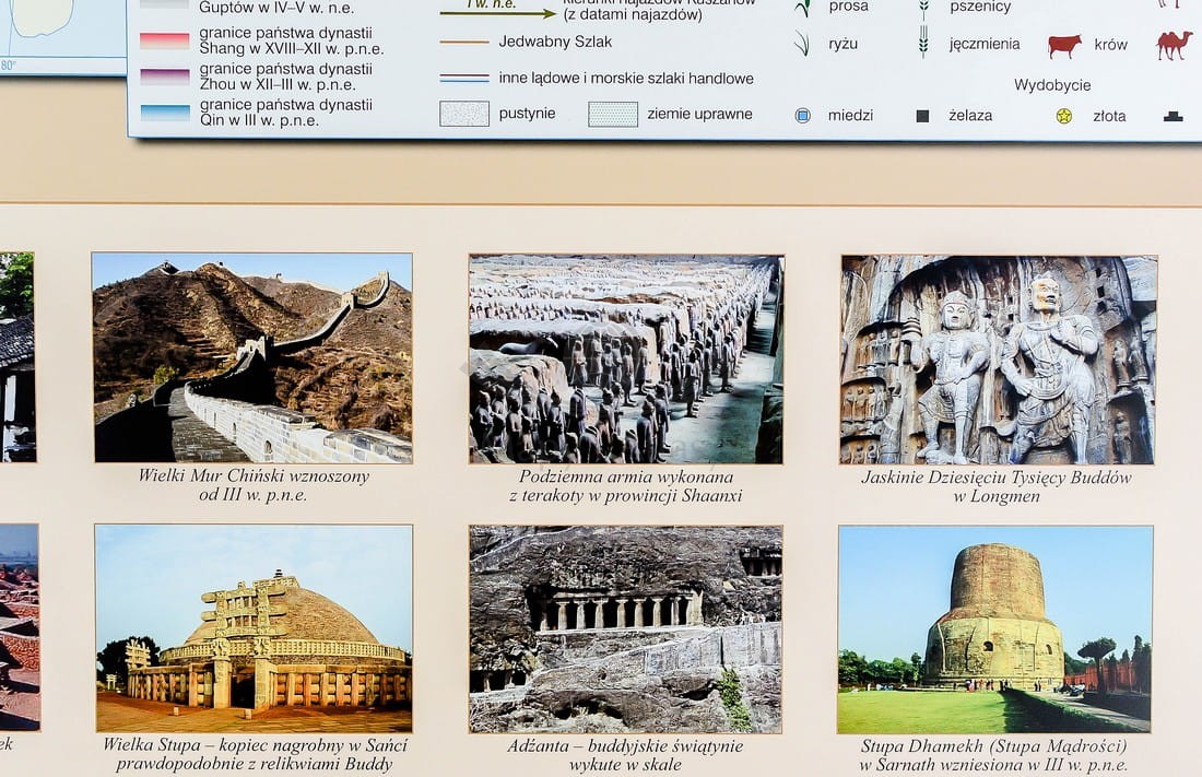 Na drugiej stronie pt. Pierwsze cywilizacje Dalekiego Wschodu, Ameryki Środkowej i Południowej zamieszczono 3 mapy. Na mapie Indie i Chiny w starożytności (XXV w. p.n.e.-III w. n.e.) w skali 1:9 000 000 przedstawiono rozwój najstarszych cywilizacji i państw dynastycznych w rejonie Dalekiego Wschodu. Mapa Wczesne cywilizacje Ameryki Środkowej w skali 1:4 500 000 przedstawia trzy najstarsze cywilizacje tej części świata: Olmeków, Majów i Zapoteków. Poniżej zamieszczono mapę Wczesnych cywilizacji Ameryki Południowej (IX w. p.n.e.-V w. n.e.) w skali 1:4 500 000. Na wszystkich mapach pokazano również szlaki handlowe, hodowlę zwierząt i uprawy roślin pochodzących z tych rejonów świata oraz miejsca występowania obiektów charakterystycznych dla tychże cywilizacji. Stronę uzupełniają zdjęcia przedstawiające obiekty i miejsca związane z poszczególnymi cywilizacjami, które przetrwały do dziś.