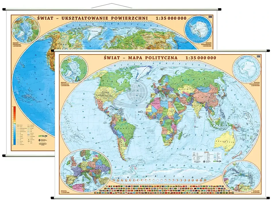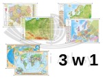 Polska, Europa, świat. Zestaw: 3 x dwustronna mapa ścienna. Polityczna / fizyczna. ArtGlob