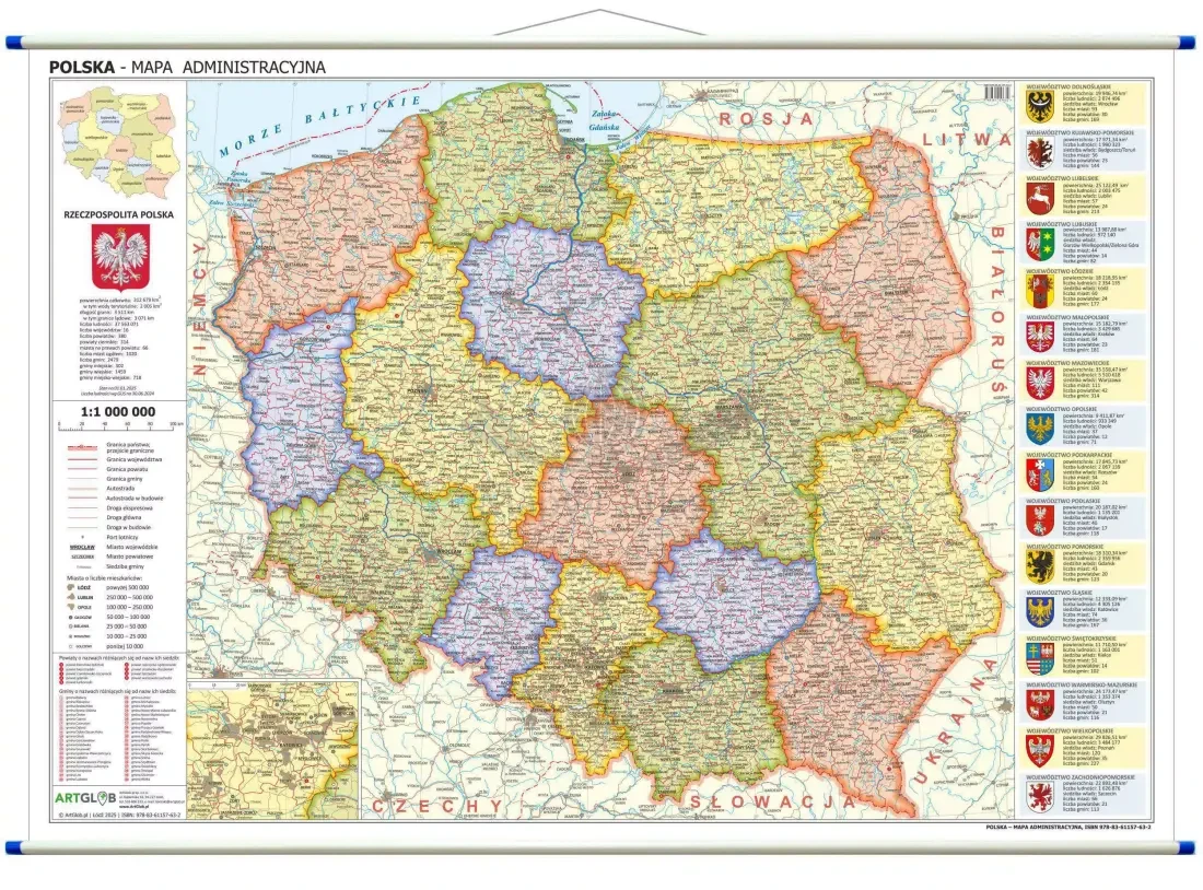 1. Dwustronna mapa ścienna Polski - fizyczna i administracyjna w skali 1:1 000 000 - wyd. 2025.