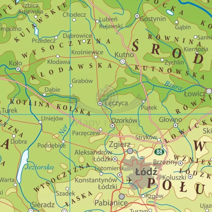 Mapa fizyczna Polski przedstawia ukształtowanie powierzchni Polski w postaci klasycznej siatki poziomic, dodatkowo podkreślona jest to atrakcyjnym wizualnie cieniowaniem. Mapa zawiera również szeroką informację przedstawiającą krainy geograficzne, a także główne drogi. Dodatkowo naniesiono obszary parków narodowych i punktowo parki krajobrazowe waz z ich opisem. Klasyczna kolorystyka, czytelność i najwyższa jakość edytorska dopełnia całości. Mapa jest idealną pomocą dydaktyczną dla uczniów i studentów, jak również przyjemną ozdobą każdego wnętrza.