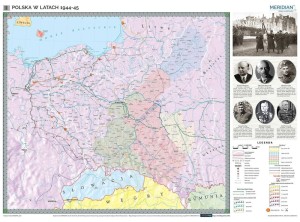 Historyczna mapa szkolna przedstawiająca sytuację na ziemiach polskich w latach 1944-1945. Wymiar mapy: 200 x 150 cm.