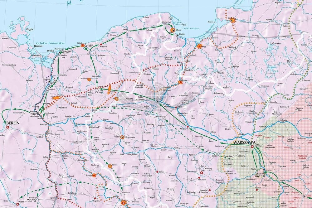 Na mapie pokazane są działania wojenne na froncie wschodnim w 1944 i 1945, szlak bojowy Pierwszej i Drugiej Armii Wojska Polskiego, a także Akcja "Burza".