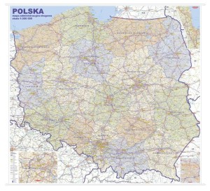 Administracyjno-drogowa ścienna mapa Polski w skali 1:350 000. Mapa papierowa foliowana dwustronnie; folia pozwala rysować na mapie przy użyciu pisaków suchościeralnych.