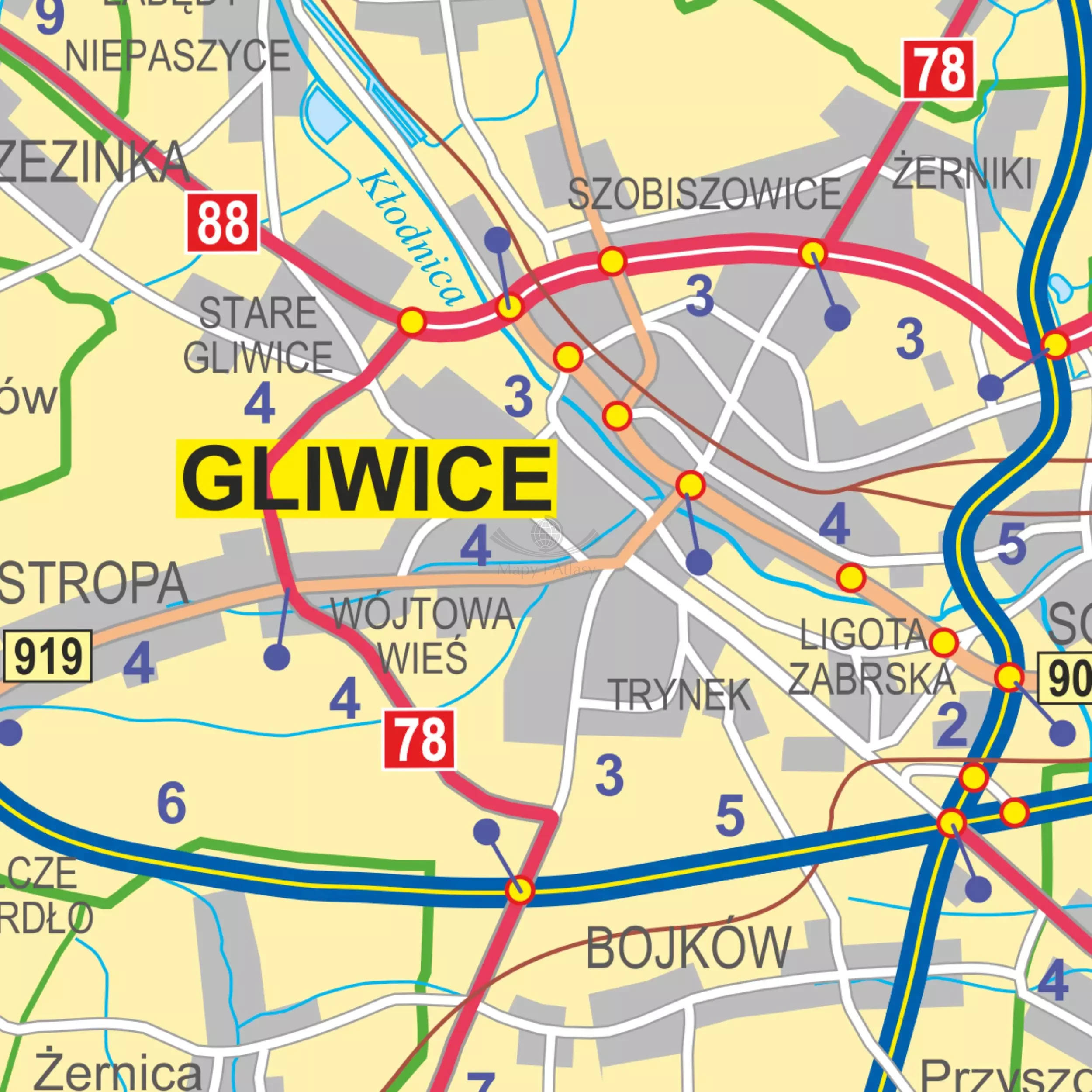 - aktualną sieć dróg i autostrad wraz z numeracją,