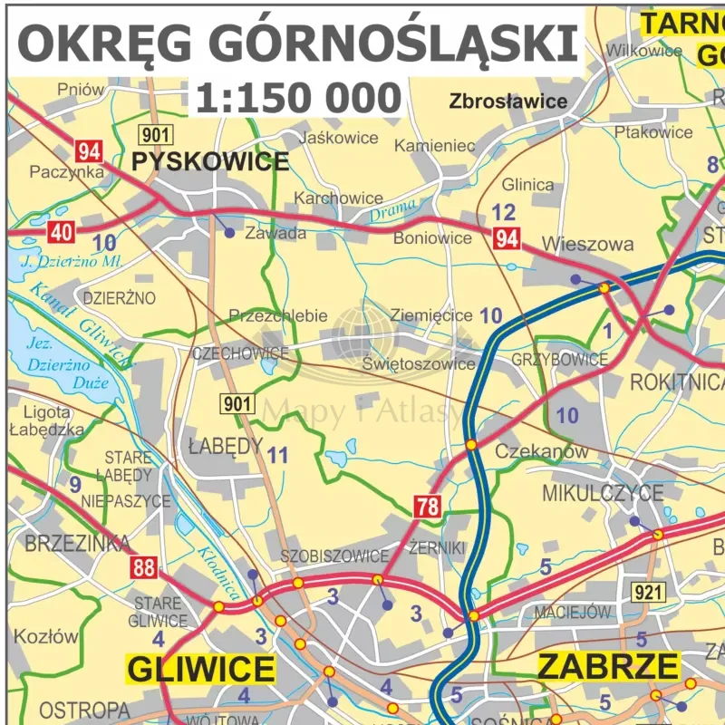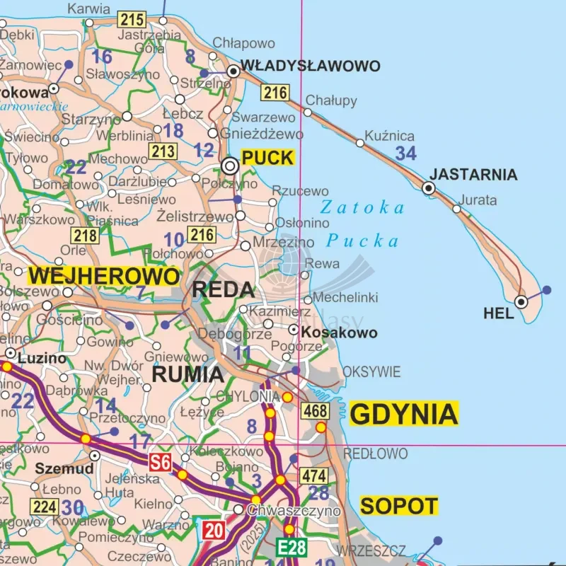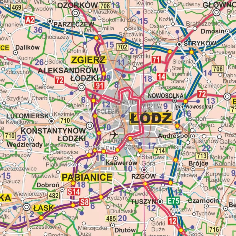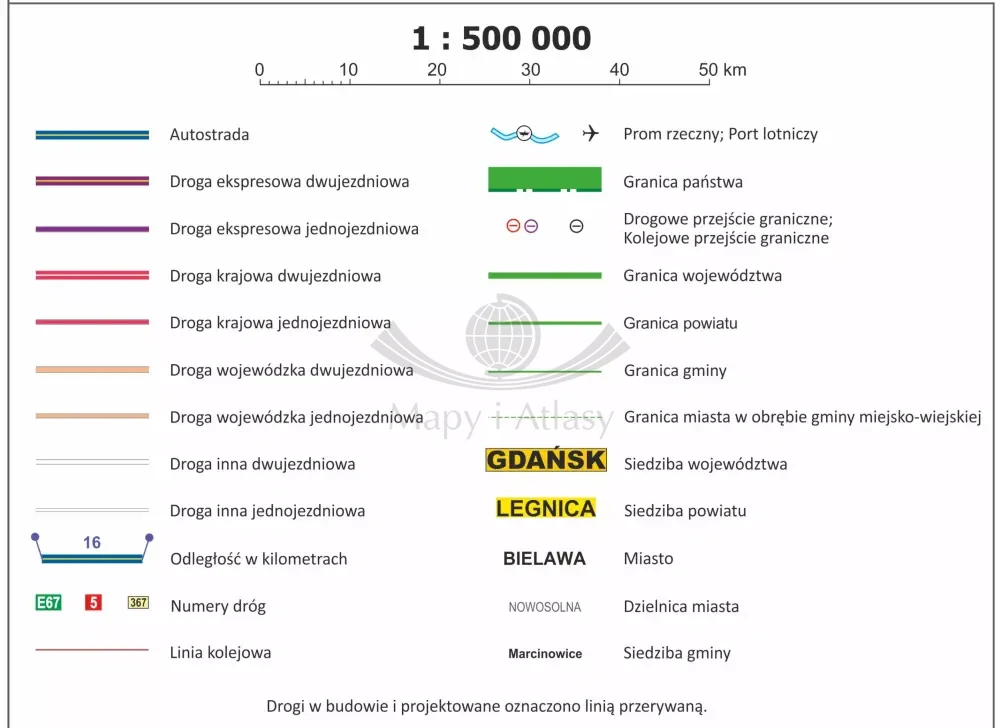 - aktualną sieć dróg i autostrad w Polsce wraz z numeracją,