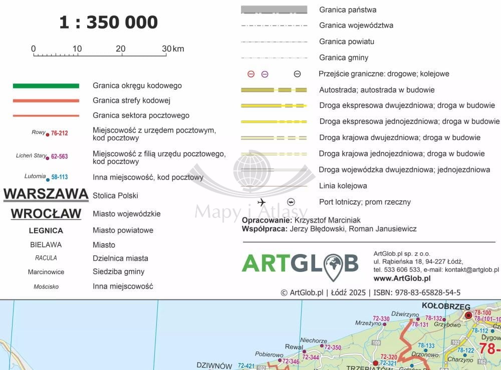 Administracyjno-drogowa mapa ścienna Polski wraz z kodami pocztowymi w skali 1:350 000 wydawnictwa ArtGlob.