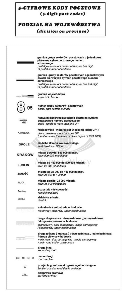 Kodowa mapa ścienna Polski w skali 1:500 000 z podstawową siecią dróg. Na mapie zaznaczono min.: drogi, numery dróg, drogowe przejścia graniczne, przeprawy promowe, granice grupy sektorów pocztowych...